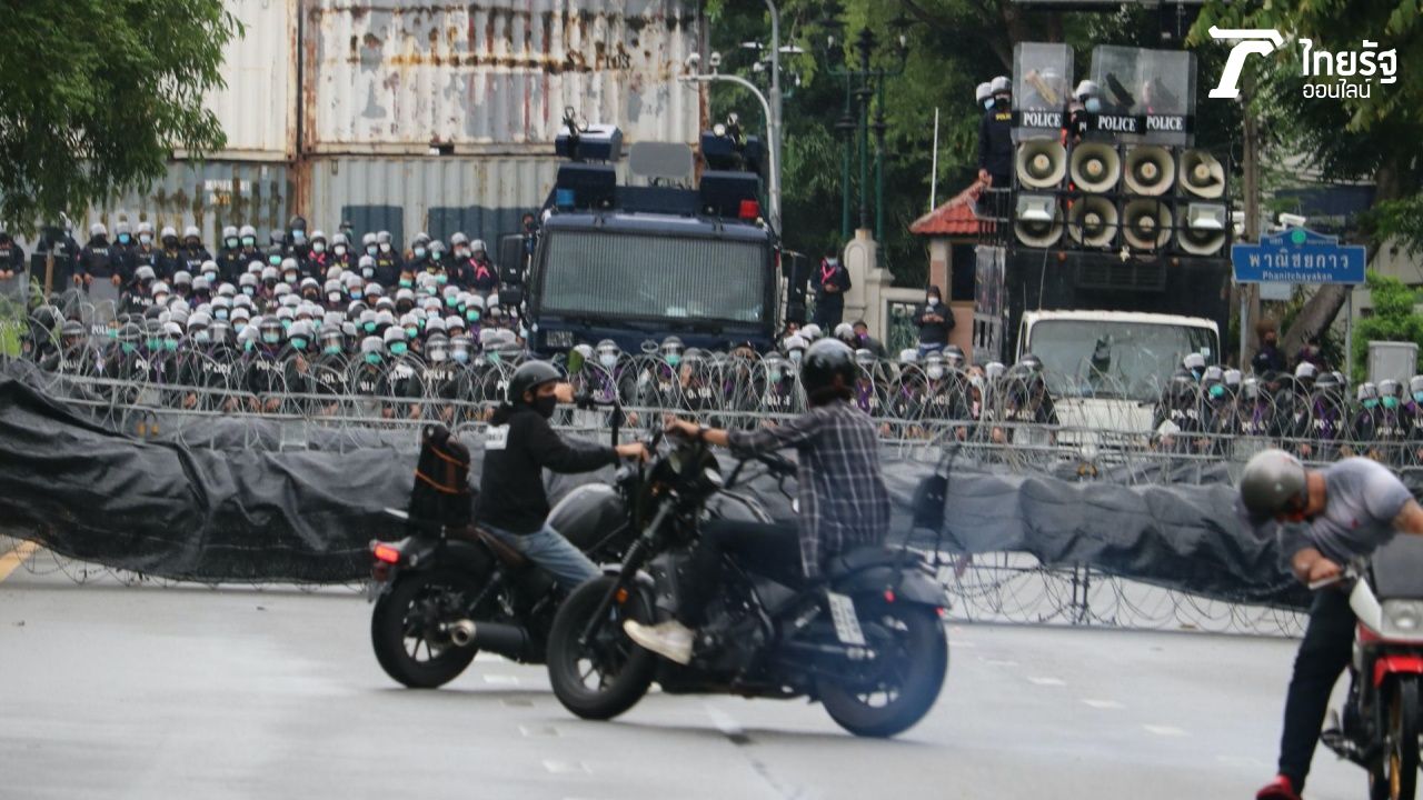 วันที่ 25 ก.ค. เมื่อ 16.00 น. นายจตุภัทร์ บุญภัทรรักษา หรือ "ไผ่-ดาวดิน" นำขบวนแห่ของหมู่บ้านทะลุฟ้า โดย กลุ่มผู้ขับขี่รถจักรยานยนต์ฮาเลย์ และจักรยานยนต์ชนิดต่างๆ จำนวนนับร้อยคัน เคลื่อนขบวนมาถึงที่บริเวณแยกนางเลิ้ง ก่อนนำแผงรั้วเหล็กที่เจ้าหน้าที่วางสกัดไว้ที่แยกนางเลิ้งออก แล้วเคลื่อนเข้ามาประชิด แนวรับของเจ้าหน้าที่ตำรวจ ที่บริเวณแยกพาณิชยการซึ่งมีทั้งรั้วลวดหนามแผงรั้วเหล็กและรถฉีดน้ำแรงดันสูงตั้งสกัดไว้ ทั้งนี้ กลุ่มมวลชนจักรยานยนต์ได้ขับเข้ามาเร่งเครื่องบริเวณหน้าแนวรั้วลวดหนามด่าทอใส่เจ้าหน้าที่ ขณะที่ตำรวจหลังแนวรับได้ใช้เครื่องขยายเสียงประชาสัมพันธ์แจ้งเตือนให้ยุติการชุมนุม และห้ามไม่ให้มีการประท้วง หรือแนวรั้วลวดหนามหรือสิ่งกีดขวางที่วางไว้ออก