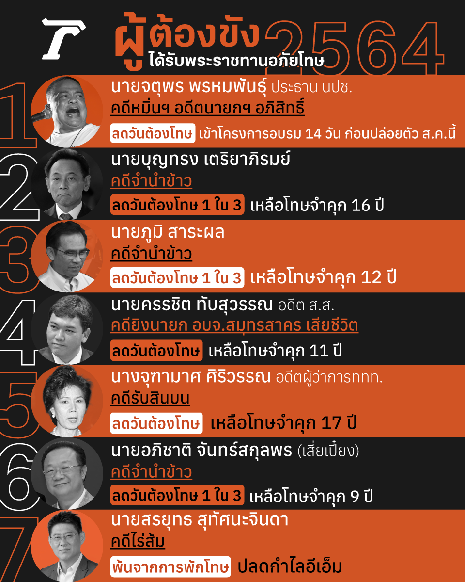 เปิดรายชื่อ คนดัง-อดีตนักการเมือง ได้รับพระราชทานอภัยโทษ พ.ศ.2564 "จตุพร-บุญทรง-ภูมิ-ครรชิต-จุฑามาศ-อภิชาติ-สรยุทธ" เข้าหลักเกณฑ์ลดวันต้องโทษ-พ้นการพักโทษ ครั้งนี้ด้วย