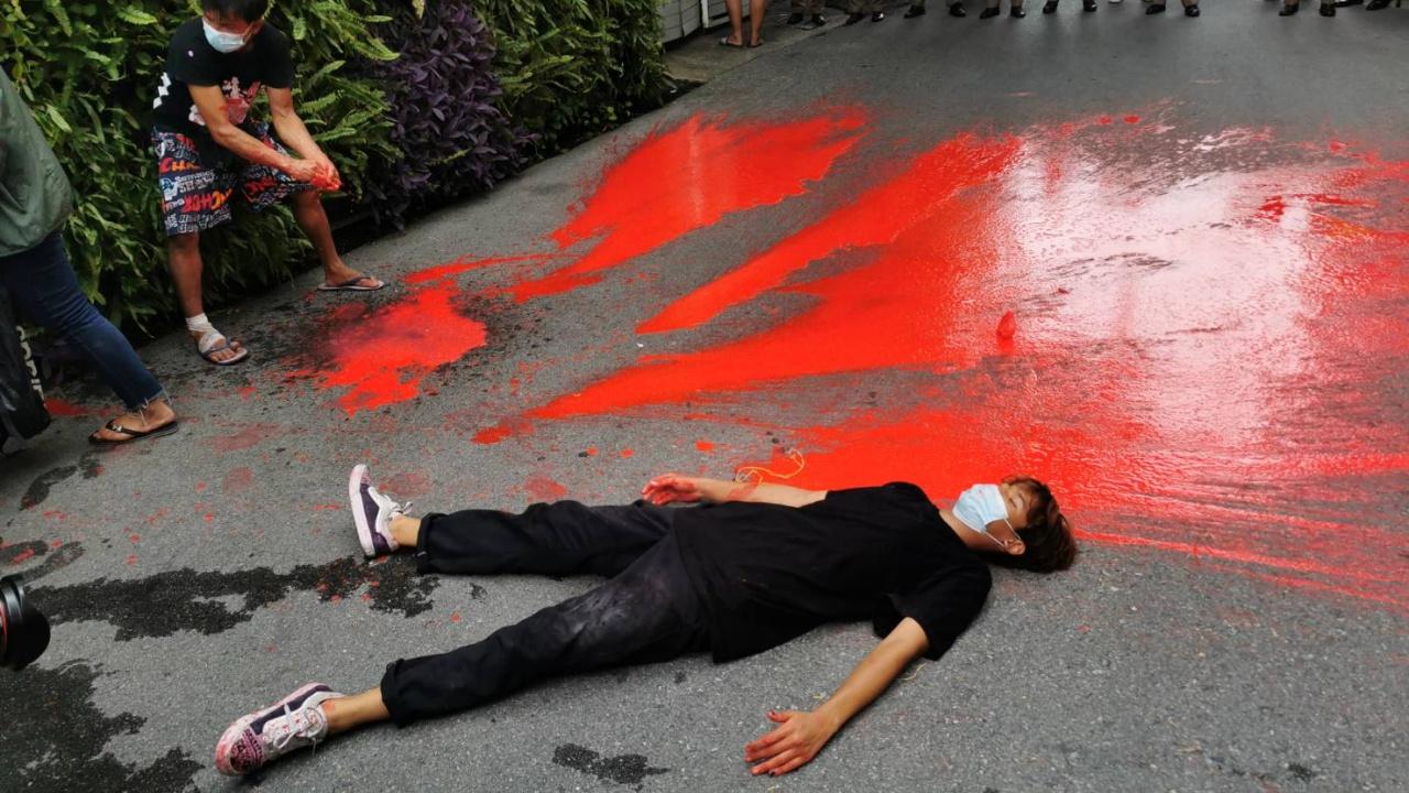 ขณะที่บรรดาผู้ชุมนุมบางส่วนได้ทยอยเดินอ้อมรั้วเหล็กริมถนนด้านหน้าพรรคเข้ามาที่ลานพระแม่ธรณีบีบมวยผม สิ่งศักดิ์สิทธิ์และสัญลักษณ์ประจำพรรค จนเกิดการปะทะกับชาย 2 คน ที่พยายามผลักดันผู้ชุมนุมไม่ให้เข้ามาในบริเวณที่ทำการพรรค เกิดการผลักดันแผงรั้วเหล็ก โดยตำรวจได้แยกคู่ปะทะออกจากกัน ทำให้กลุ่มผู้ชุมนุมได้ดันแนวแผงรั้วแตกและบุกเข้ามาแปะสติกเกอร์รูปการ์ตูนพล.อ.ประยุทธ์ ที่ป้ายไวนิลรูปของนายจุรินทร์ ลักษณวิศิษฏ์ หัวหน้าพรรค รองนายกฯและรมว.พาณิชย์ ทั้งที่ใบหน้า และศีรษะพร้อมใช้มือจุ่มสีแดงเขียนคำหยาบคายที่กระจกด้านหน้าพรรคและแปะกระดาษข้อความโจมตีพรรคประชาธิปัตย์ ขณะที่ผู้ชุมนุมบางส่วนได้สาดสีแดงลงบนพื้นบริเวณทางเข้าพรรคและนอนบนพื้นเหมือนคนตายจากความล้มเหลวของการแก้ไขปัญหาโควิด-19
