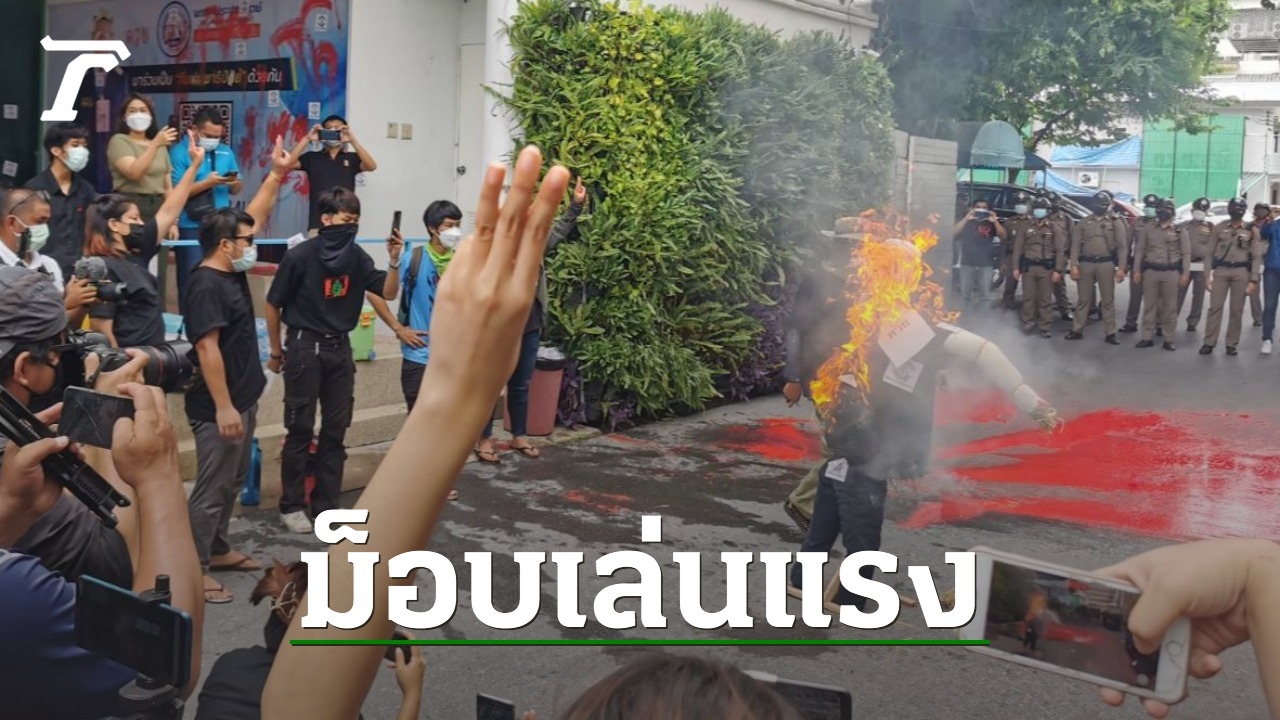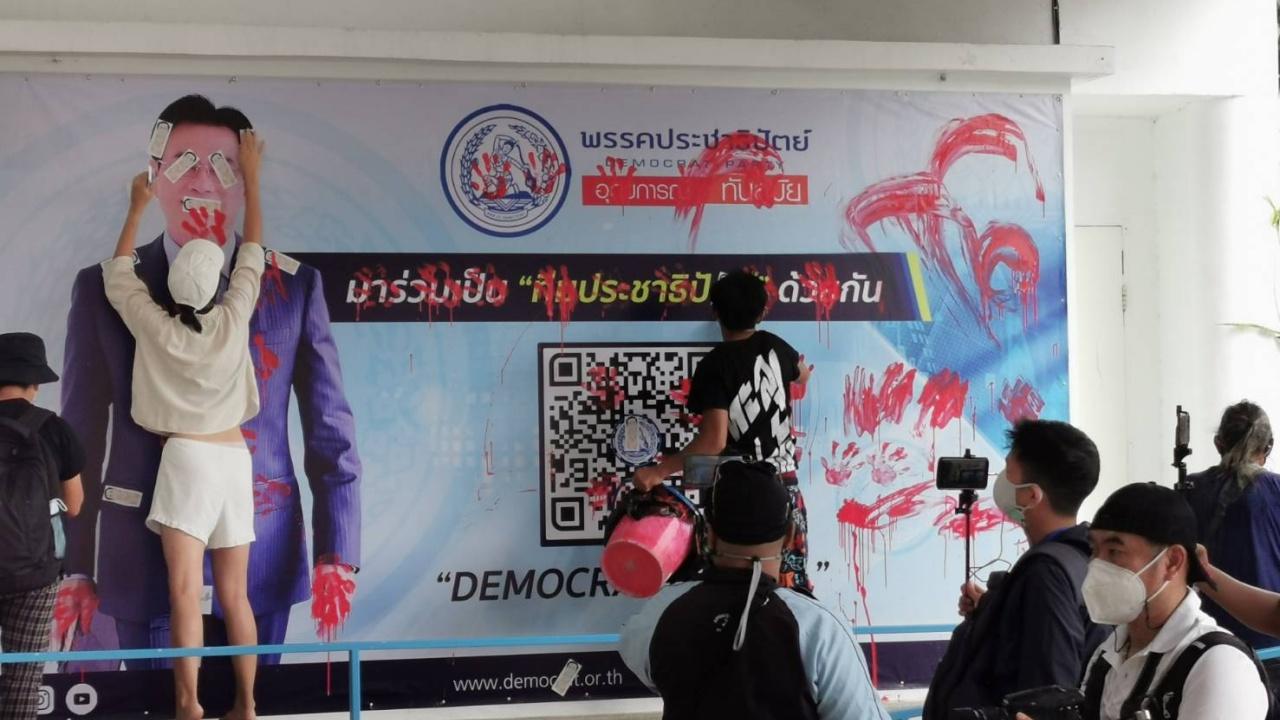 ถึงคิว ปชป. "ม็อบทะลุฟ้า" มาตามนัด ขอถอนตัวรัฐบาล ป้ายแบนเนอร์ไวนิล "จุรินทร์" เลอะสีเละเทะ เผาหุ่นฟาง "ประยุทธ์" รอดูพรรคเก่าแก่ ตายยกรัง เลือกตั้งครั้งหน้า