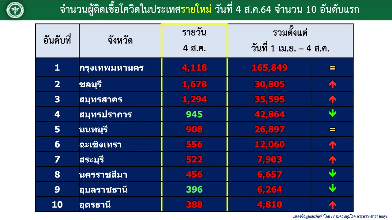 สำหรับผู้ติดเชื้อรายจังหวัด 5 จังหวัด มากที่สุดยังคงเป็นกรุงเทพมหานคร โดยวันนี้มีผู้ติดเชื้อถึง 4,118 ราย รองลงมาคือ ชลบุรี 1,678 ราย สมุทรสาคร 1,294 ราย สมุทรปราการ 945 ราย และนนทบุรี 908 ราย.