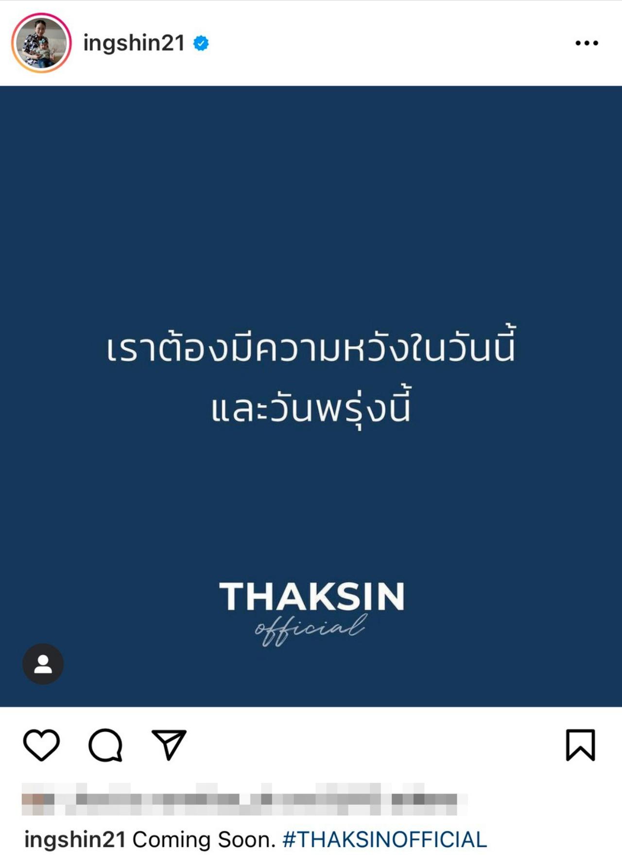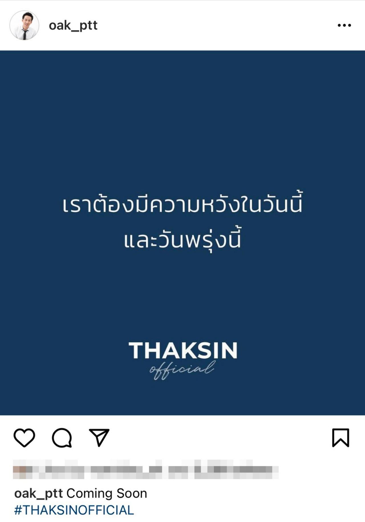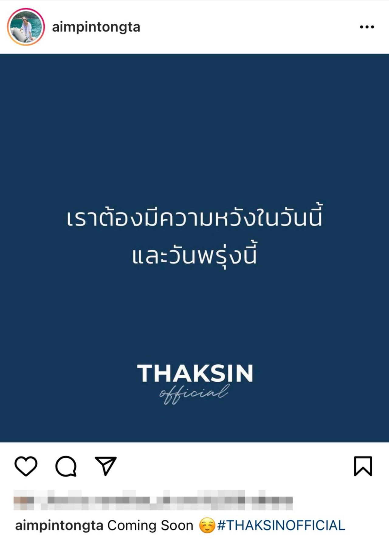 วันที่ 5 ส.ค. 2564 โอ๊ค พานทองแท้ ชินวัตร พร้อมด้วย เอม พินทองทา คุณากรวงศ์ และ อุ๊งอิ๊ง แพทองธาร ชินวัตร บุตรชายและบุตรสาวของนายทักษิณ ชินวัตร อดีตนายกรัฐมนตรี หรือ โทนี่ วู้ดซัม โพสต์ภาพพร้อมข้อความเดียวกันในอินสตาแกรม โดยมีข้อความว่า "เราต้องมีความหวังในวันนี้และวันพรุ่งนี้" พร้อมระบุว่า Coming Soon #THAKSINOFFICIAL โดยมีคนเข้ามาคอมเมนต์และกดส่งรูปหัวใจกันเป็นจำนวนมาก พร้อมสอบถามว่าอะไร ยังไง ตื่นเต้นแล้ว รออย่างมีความหวังและขอให้นายทักษิณ กลับมา.