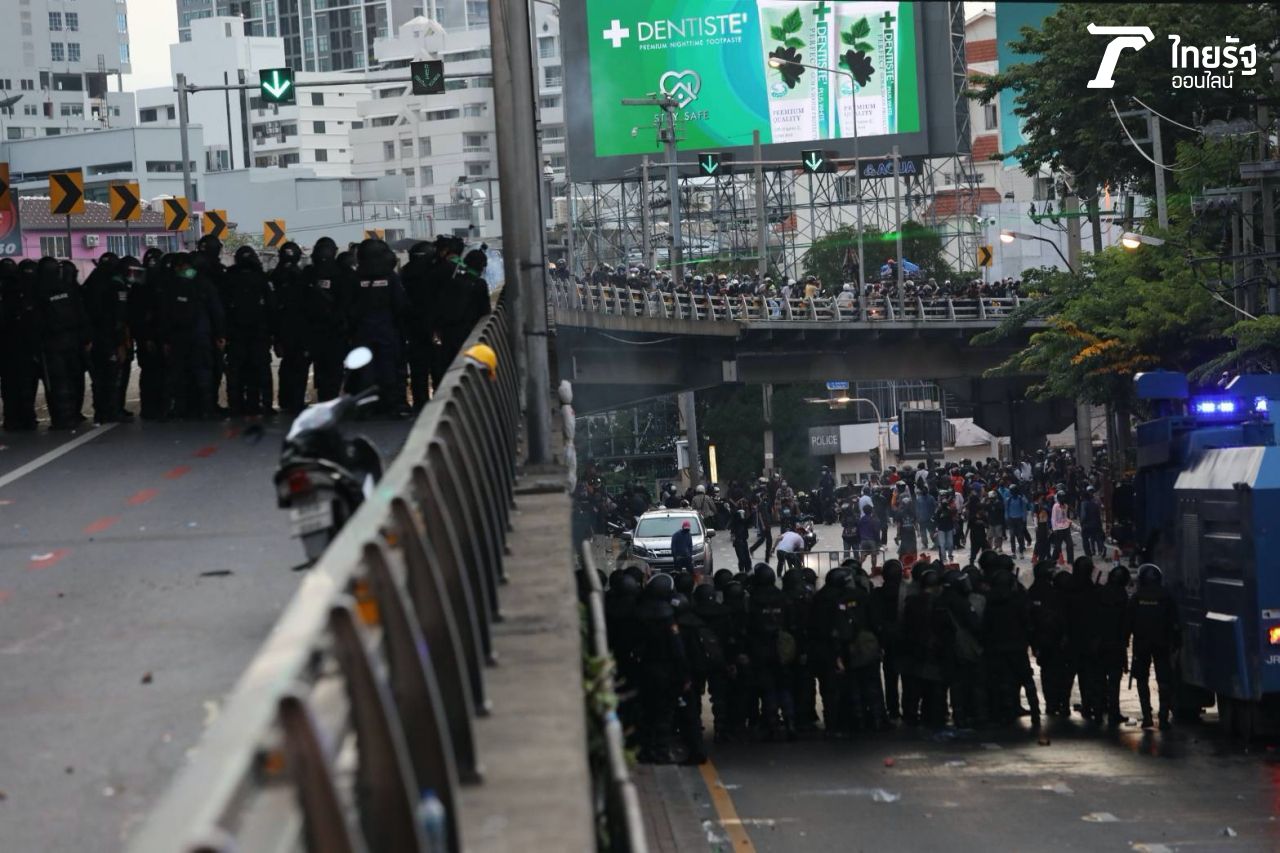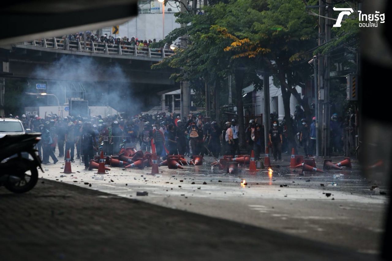 เมื่อเวลา 18.35 น. วันที่ 10 สิงหาคม 2564 ผู้สื่อข่าวรายงานสถานการณ์การปะทะต่อเนื่องว่า ตำรวจควบคุมฝูงชนยังคงตั้งแนวเพื่อกระชับพื้นที่บนสะพานข้ามแยกราชปรารภ แต่ก็ผู้ชุมนุมยิงพลุ ปาประทัด และขวดเข้าใส่หลายครั้ง ซึ่งเจ้าหน้าที่ก็ยิงแก๊สน้ำตาและกระสุนยางตอบโต้ ขณะที่ด้านล่างก็นำรถฉีดน้ำแรงดันสูง (จีโน่) มาเตรียมการไว้ด้วย