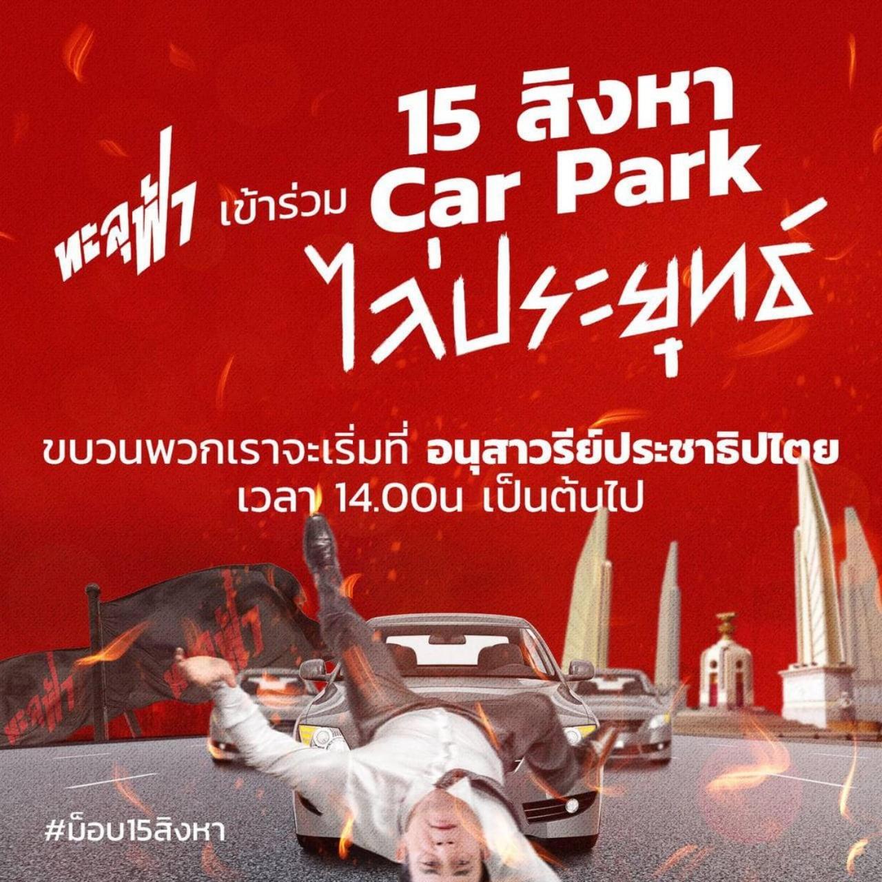 วันที่ 14 ส.ค. เฟซบุ๊ก "ทะลุฟ้า - thalufah" ของกลุ่มผู้ชุมนุมที่เรียกตัวเองว่ากลุ่มทะลุฟ้า ของนายจตุภัทร์ บุญภัทรรักษา หรือ ไผ่ ดาวดิน โพสต์ข้อความระบุว่า "ประกาศ ทะลุฟ้าเข้าร่วม 15 สิงหา Car Park ไล่ประยุทธ์ ขบวนพวกเราจะเริ่มที่อนุสาวรีย์ประชาธิปไตย เวลา 14.00 น. เป็นต้นไป ขบวน Car Park มี 3 จุด 1. จุดนัดพบวินรถตู้ตรงข้ามอยุธยาปาร์ค (ปลายทางห้าแยกลาดพร้าว) 2. จุดนัดพบแยกราชประสงค์ 3. จุดนัดพบอนุสาวรีย์ประชาธิปไตย วันหยุดนี้สะดวกที่ไหนไปที่นั่น ร่วมกันออกไปขับไล่ประยุทธ์กันค่ะ"
