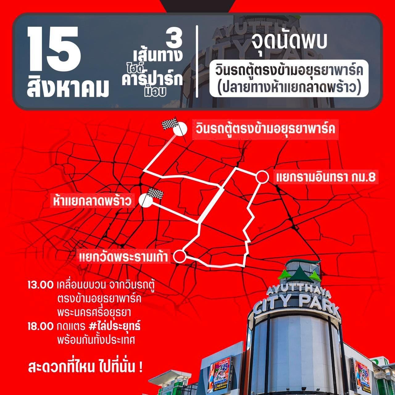 รวมเส้นทาง Car Park (Car Mob + Hyde Park) ม็อบ 15 สิงหา “ณัฐวุฒิ - สมบัติ” นำขบวนบีบแตรขับไล่ “พล.อ.ประยุทธ์”