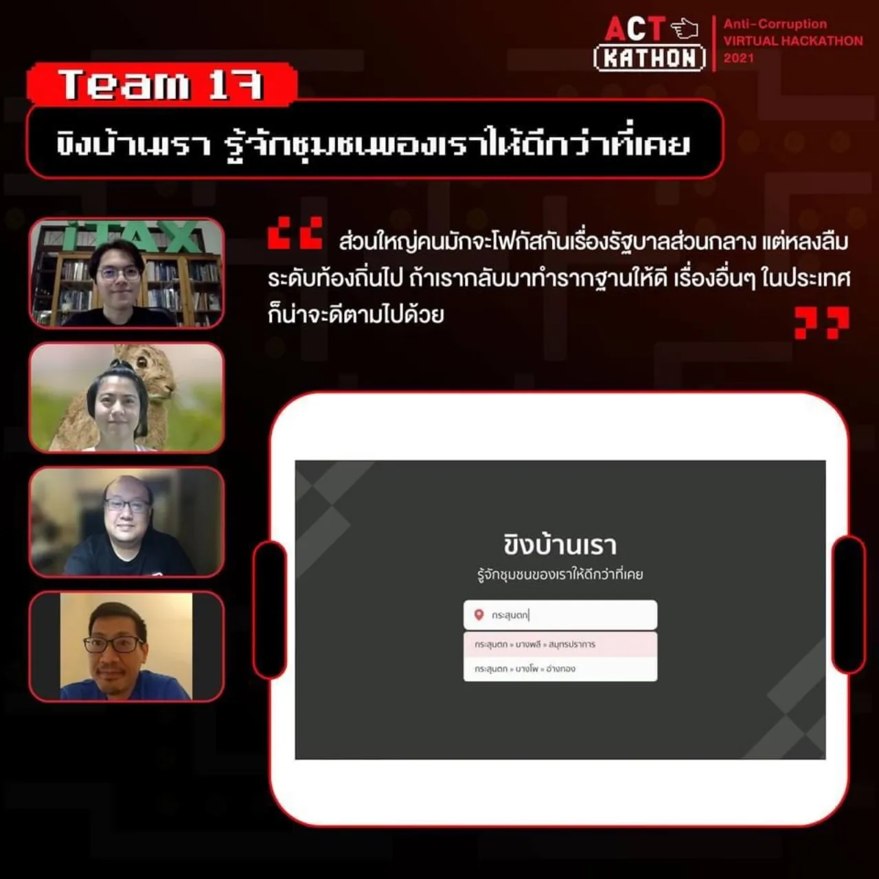 ทั้งนี้องค์กรต่อต้านคอร์รัปชัน (ประเทศไทย) หรือ ACT และพันธมิตร จัดแข่งขันรอบสุดท้าย ของ 5 ทีมที่เข้ารอบ Final Round Demo Day ในกิจกรรม ACTkathon: Anti-Corruption VIRTUAL HACKATHON 2021 ภายใต้แนวคิด “พลิกเกมโกงให้อยู่หมัด สร้างไอเดียรัฐเปิดเผย” ซึ่งได้คัดเลือกผู้เข้าแข่งขันกว่า 100 คน จาก 20 ทีม เหลือ 5 ทีมสุดท้าย โดยถ่ายทอดสด ผ่าน Facebook Page: องค์กรต่อต้านคอร์รัปชัน