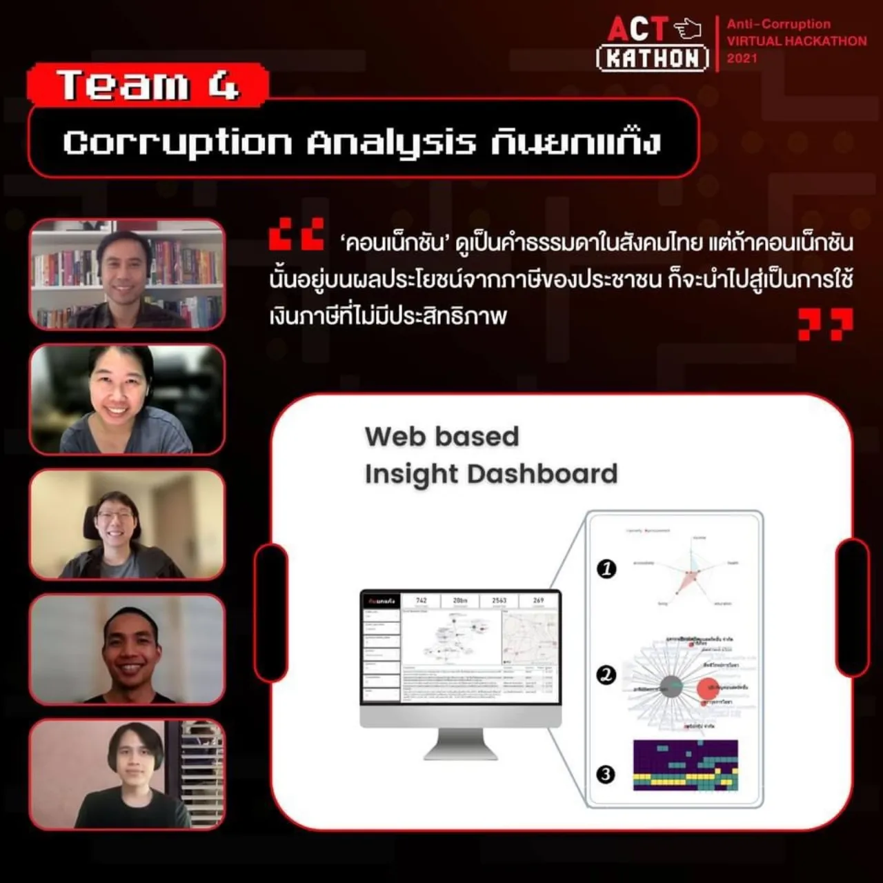 และ ทีม 4: Corruption Analysis “กินยกแก๊ง” แพลตฟอร์ม วิเคราะห์ความเชื่อมโยงความสัมพันธ์ระหว่างนักการเมือง เครือข่ายธุรกิจ และเครือญาติเพื่อหาความผิดปกติในการคอร์รัปชัน สมาชิกของทีม ประกอบด้วย ณัฐพงษ์ พัฒนผล, ศุภฤกษ์ พิสิฐศุภกานต์, นภา วงศ์ไชยบริหาร คำนันท์ และ ถมทอง นาถมทอง
