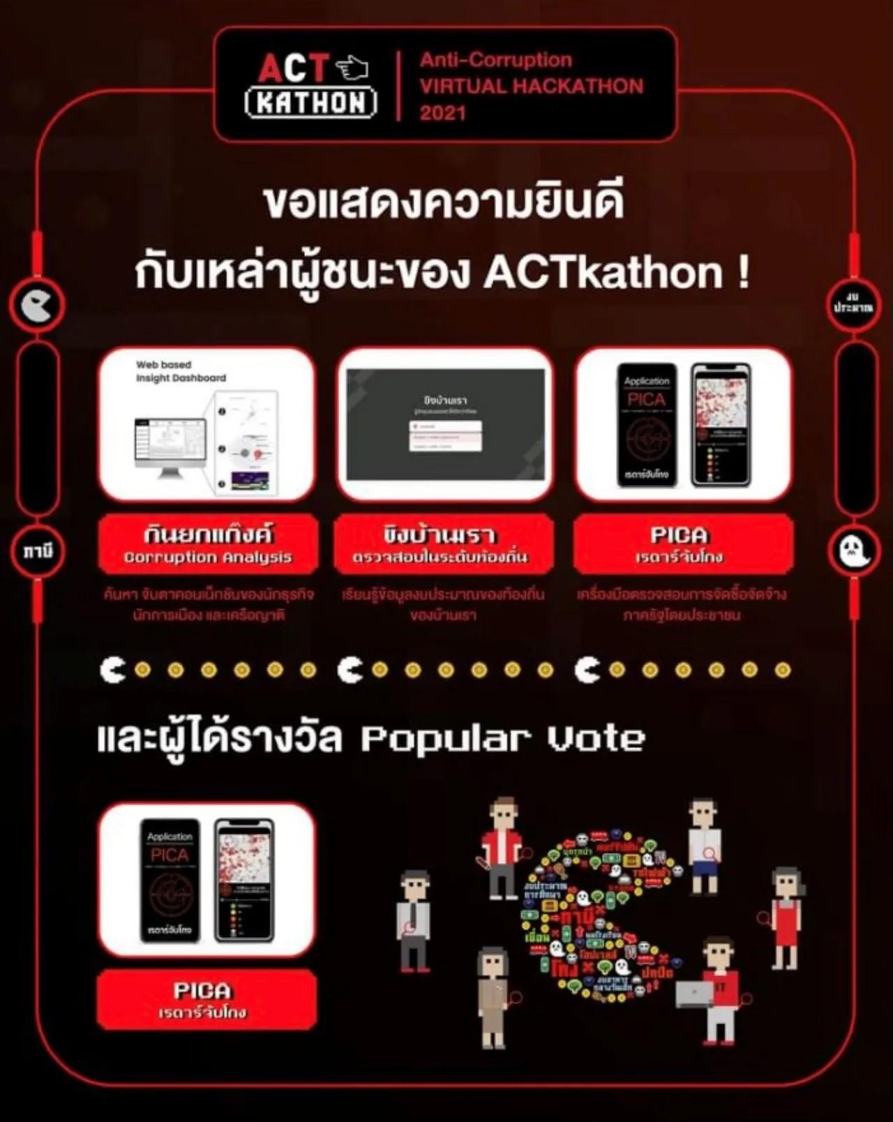 สำหรับทีมที่ได้รับรางวัล Popular Vote คือ ทีม 1: Application PICA เรดาห์จับโกง รับเงินรางวัล 20,000 บาท.
