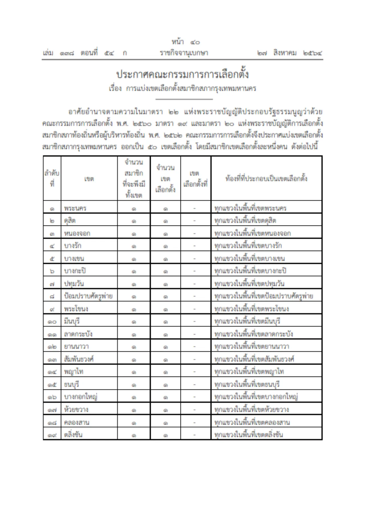 ราชกิจจานุเบกษา เผยแพร่ประกาศคณะกรรมการการเลือกตั้ง แบ่งเขตการเลือกตั้ง กทม. ออกเป็น 50 เขต ให้มีสมาชิกเขตเลือกตั้งละหนึ่งคน