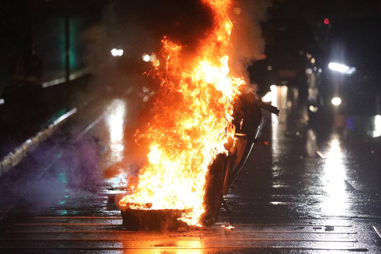 กระทั่งเวลา 19.30 น. กลุ่มทะลุแก๊สได้นำรถ จยย.ของ ตร.ไม่รู้ว่าเอามาจากไหน มาจุดเผากับ ยางรถยนต์บริเวณก่อนทางลงอุโมงค์ ที่มุ่งหน้ามาจาก อนุสาวรีย์ชัยฯ ทำให้เกิดเปลวไฟรุนแรงและรถ จยย. ถูกเผาไหม้วอดทั้งคัน ทำให้การจราจรติดขัดอย่างหนัก