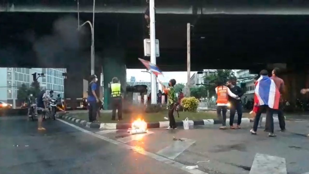 ม็อบ 10 กันยา ที่สามเหลี่ยมดินแดง ผู้ชุมนุมทะลุแก๊ซ ทยอยรวมตัวในพื้นที่ โดยมีเสียงคล้ายประทัดดังขึ้นอย่างต่อเนื่อง ด้านตำรวจควบคุมฝูงชน ยังไม่มีความเคลื่อนไหว
