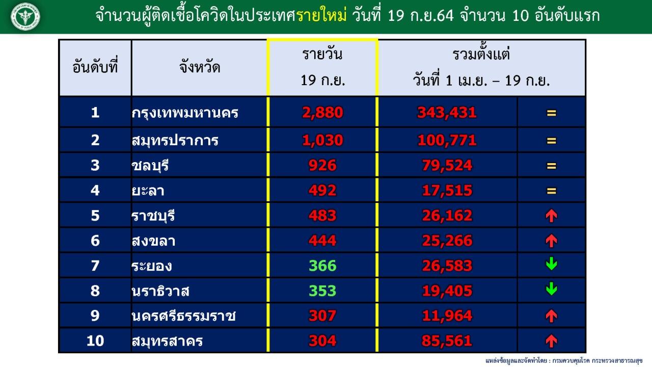 วันที่ 19 ก.ย. 2564 ศูนย์บริหารสถานการณ์การแพร่ระบาดของโรคติดเชื้อไวรัสโคโรนา 2019 (โควิด-19) หรือ ศบค. รายงานสถานการณ์ผู้ติดเชื้อโควิด-19 ในประเทศไทยมีรายละเอียดดังนี้