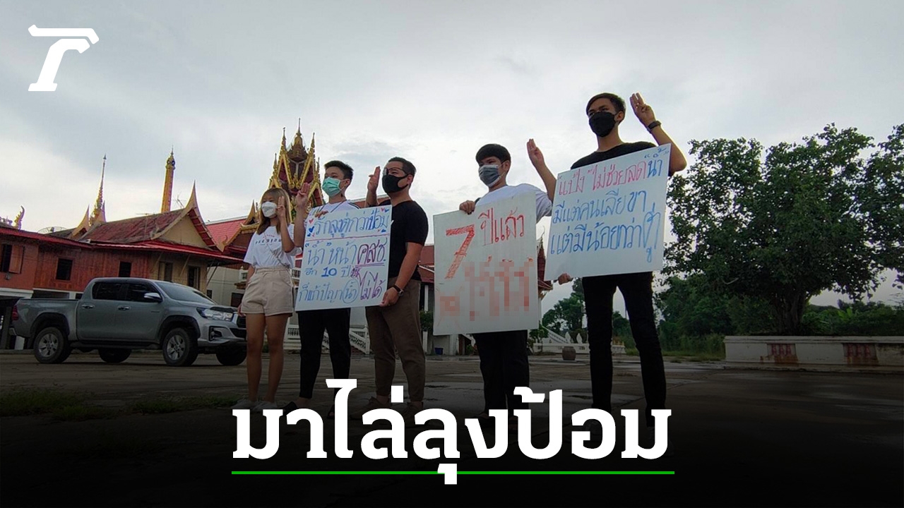 ไฮโซลูกนัท พร้อมคณะราษฎรอยุธยา ยืนถือป้ายชู 3 นิ้ว รอต้อนรับ พล.อ.ประวิตร ลงพื้นที่ แต่ถูกตำรวจกันตัวไม่ให้เข้าไปแสดงออกเชิงสัญลักษณ์