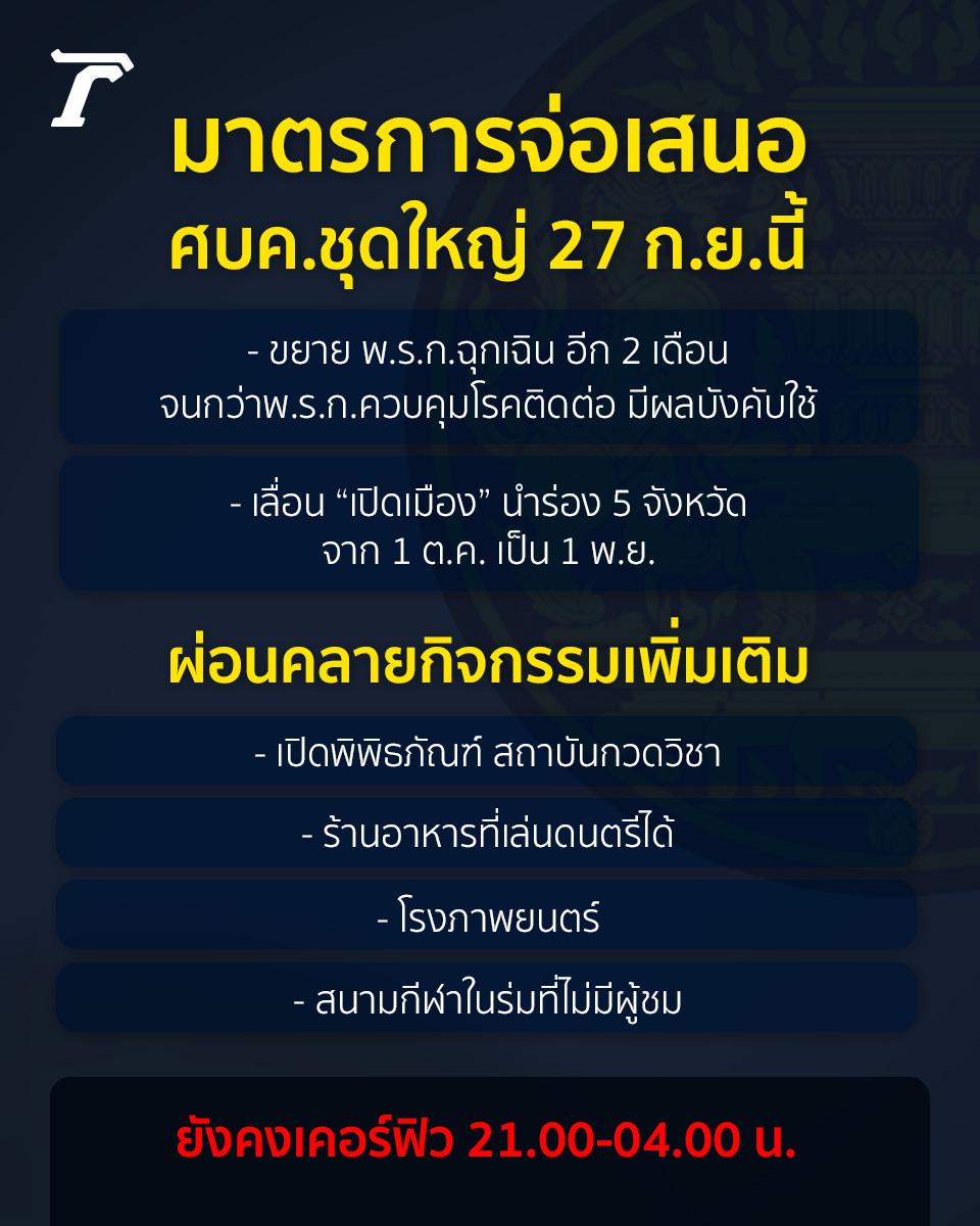 นอกจากนี้ ยังจะเสนอให้ผ่อนคลายกิจกรรมเพิ่มเติม เช่น การเปิดพิพิธภัณฑ์ สถาบันกวดวิชา ร้านอาหารที่เล่นดนตรีได้ โรงภาพยนตร์ สนามกีฬาในร่มที่ไม่มีผู้ชม แต่มาตรการงดออกจากเคหสถาน ยังคงเป็นไปตามเดิม คือเวลา 21.00 น. -04.00 น. โดยจะเสนอมติดังกล่าวต่อที่ประชุม ศบค.ชุดใหญ่ ที่มี พล.อ.ประยุทธ์ จันทร์โอชา นายกรัฐมนตรีและ รมว.กลาโหม ในฐานะ ผอ.ศบค. เป็นประธานพิจารณาอีกครั้ง วันที่ 27 ก.ย.นี้ ซึ่งผลจะเป็นอย่างไรขึ้นอยู่กับที่ประชุม ศบค.ชุดใหญ่