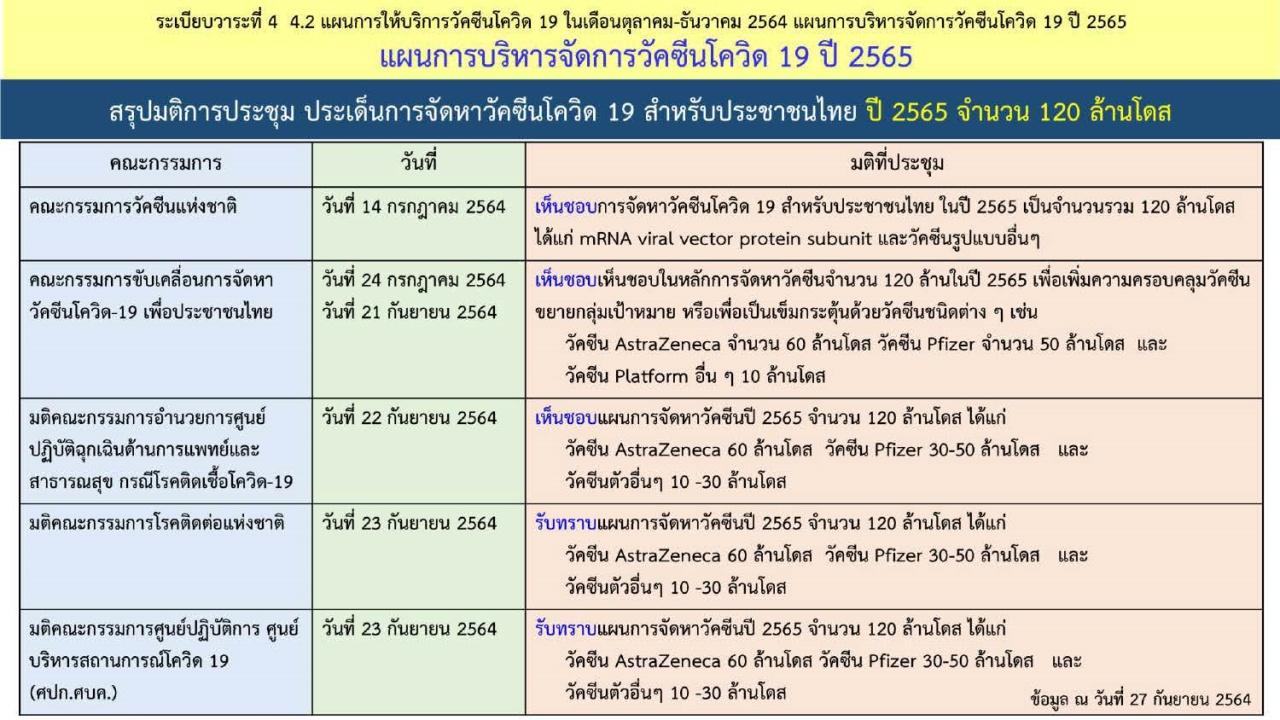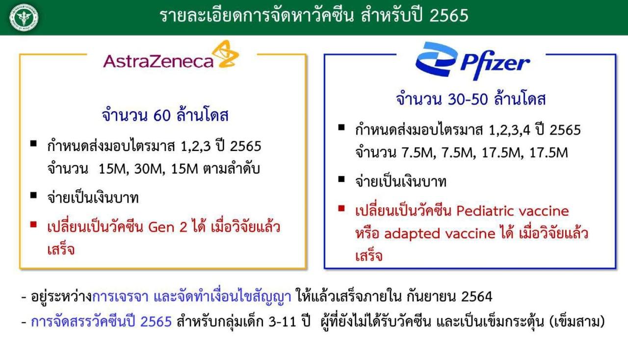 กำหนดส่งมอบตั้งแต่ไตรมาสที่ 1-3 ปี 2565 จำนวน 15 ล้านโดส, 30 ล้านโดส และ 15 ล้านโดส ตามลำดับ - Pfizer จำนวน 30-50 ล้านโดส