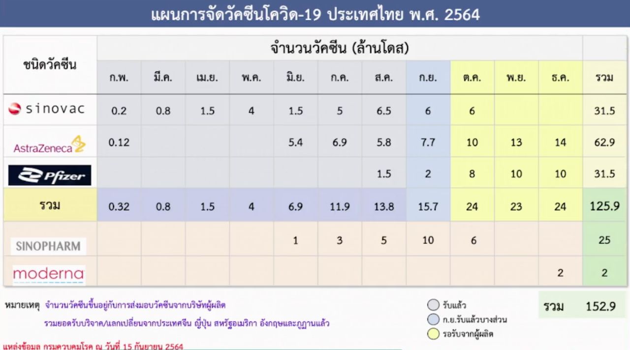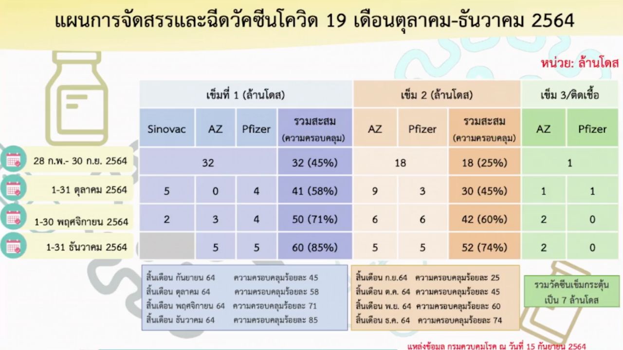 ขณะที่แผนการจัดสรรและฉีดวัคซีนตั้งแต่ 28 กุมภาพันธ์ จนถึง 30 กันยายน เข็มที่ 1 รวม 3 วัคซีน (ซิโนแวค, แอสตราเซเนกา, ไฟเซอร์) จะได้ราว 32 ล้านโดส ความครอบคลุมคิดเป็น 45% เข็มที่ 2 ฉีดด้วยแอสตราเซเนกา, ไฟเซอร์ 18 ล้านโดส ความครอบคลุมคิดเป็น 18% และเข็มที่ 3 กระตุ้นด้วยแอสตราเซเนกา หรือไฟเซอร์ รวม 1 ล้านโดส
