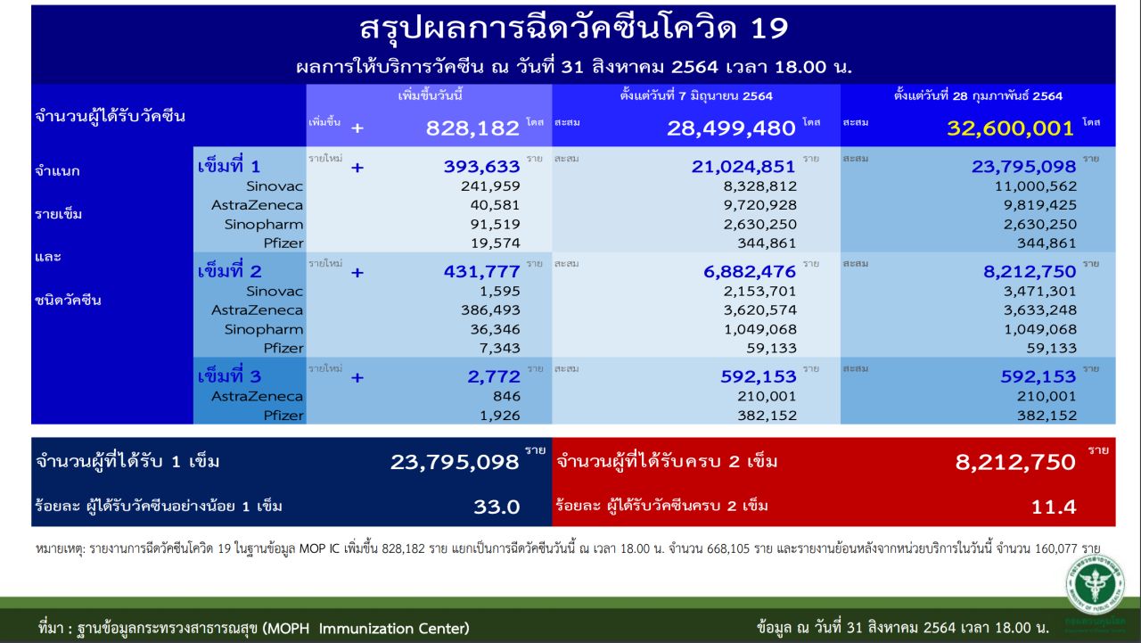 จำนวนการฉีดวัคซีน ข้อมูลการรายงาน ณ วันที่ 31 สิงหาคม 2564 เวลา 18.00 น.