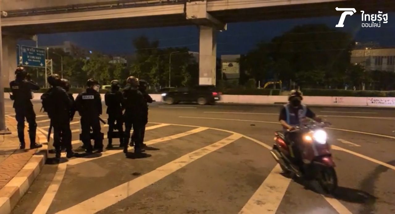 จากนั้น เวลา 21.14 น. เจ้าหน้าที่ คฝ. ได้ขึ้นรถกระบะ มุ่งหน้าไปทางสวนป่าวิภาวดี และย้ายกำลังบางส่วนมาวางกำลังใกล้กับสำนักงานเขตดินแดง โดยคาดว่ากำลังอีกส่วนน่าจะรวมกับเจ้าหน้าที่ สถานีตำรวจนครบาลดินแดง ขณะที่บริเวณ ถ.มิตรไมตรี มีเสียงดังคล้ายประทัดเป็นระยะ แต่เจ้าหน้าที่ก็ไม่มีการตอบโต้แต่อย่างใด
