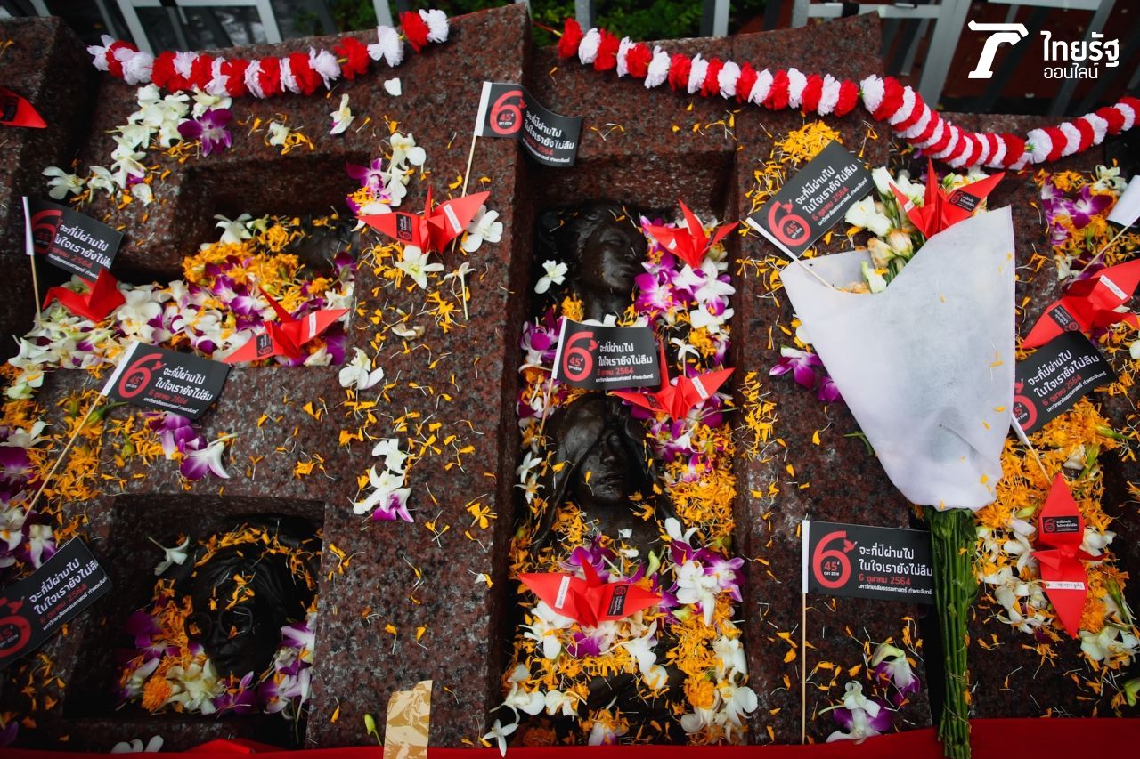 วันที่ 6 ต.ค. 2564 ที่มหาวิทยาลัยธรรมศาสตร์ ท่าพระจันทร์ นักศึกษาและมวลชนมาร่วมกิจกรรม “6 ตุลา หนี้เลือดที่ยังไม่ชดใช้” ที่สวนประติมากรรมประวัติศาสตร์ ธรรมศาสตร์กับการต่อสู้เพื่อประชาธิปไตย โดยแฟนเพจเฟซบุ๊ก 45 ปี 6 ตุลา ระบุ เพื่อรำลึกประวัติศาสตร์บาดแผลของเหล่าวีรชน 6 ตุลา เหตุโศกนาฏกรรมครั้งนี้ไม่ใช่เพียงบาดแผลของธรรมศาสตร์เท่านั้น แต่เป็นของประชาชนทุกคน โดยกิจกรรมเริ่มขึ้นตั้งแต่ช่วงเช้าที่ผ่านมา โดยมีทั้ง นายจาตุรนต์ ฉายแสง นายณัฐวุฒิ ใสยเกื้อ นพ.ทศพร เสรีรักษ์ นายธนาธร จึงรุ่งเรืองกิจ นายพิธา ลิ้มเจริญรัตน์ น.ส.พรรณิการ์ วานิช รวมถึงบุคคลมีชื่อเสียงเข้าร่วม พร้อมกับการวางพวงมาลาและดอกไม้เพื่อรำลึกถึงวีรชนที่เสียชีวิต
