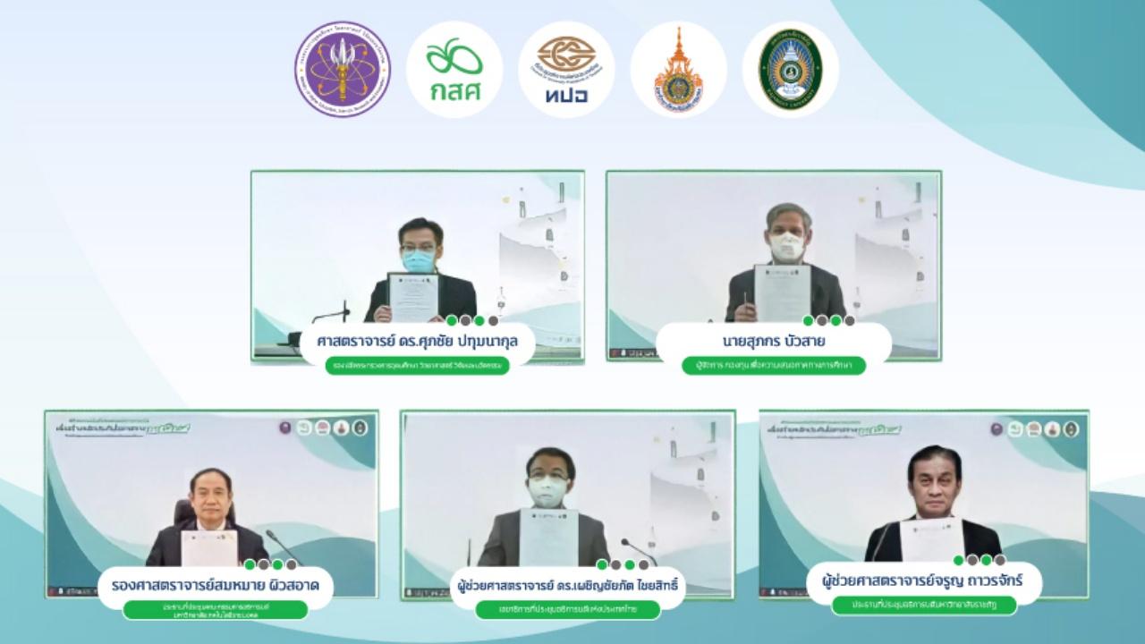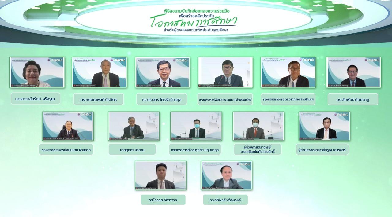 ศาสตราจารย์พิเศษ ดร.เอนก เหล่าธรรมทัศน์ รมว.การอุดมศึกษา วิทยาศาสตร์ วิจัยและนวัตกรรม (อว.) เป็นประธานในพิธีลงนามบันทึกข้อตกลงความร่วมมือเพื่อสร้างหลักประกันโอกาสทางการศึกษา สำหรับผู้ขาดแคลนทุนทรัพย์ระดับอุดมศึกษา โดยมี ศาสตราจารย์ ดร.ศุภชัย ปทุมนากุล รองปลัดกระทรวงการอุดมศึกษา วิทยาศาสตร์ วิจัยและนวัตกรรม นายแพทย์สุภกร บัวสาย ผู้จัดการกองทุนเพื่อความเสมอภาคทางการศึกษา ผู้ช่วยศาสตราจารย์ ดร.เผชิญชัยภัต ไชยสิทธิ์ เลขาธิการที่ประชุมอธิการบดีแห่งประเทศไทย (ทปอ.) รองศาสตราจารย์สมหมาย ผิวสะอาด ประธานที่ประชุมคณะกรรมการอธิการบดีมหาวิทยาลัยเทคโนโลยีราชมงคล และผู้ช่วยศาสตราจารย์จรูญ ถาวรจักร ประธานที่ประชุมอธิการบดีมหาวิทยาลัยราชภัฏ ร่วมลงนาม