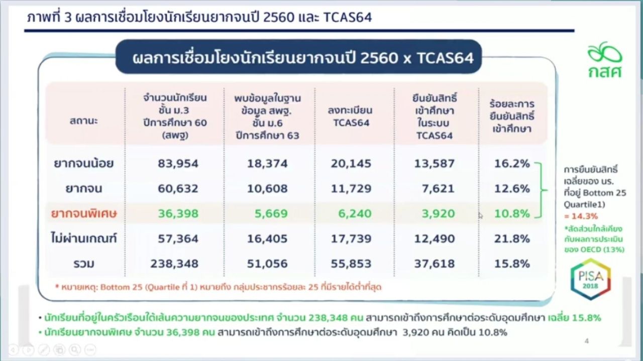 “วันนี้ถึงเวลาที่เราจะส่งมอบข้อมูลนักเรียนยากจนและยากจนพิเศษ จำนวน 11,541 คน ที่ผ่านระบบ TCAS64 ได้สำเร็จ โดยทางที่ประชุมอธิการบดีแห่งประเทศไทย (ทปอ.) จะทำงานร่วมกับมหาวิทยาลัยทั่วประเทศ เตรียมรับนักศึกษาเข้าอยู่ในความดูแล ทั้งนี้ อว. ได้กำหนดให้นโยบายการทำงานครั้งนี้ จะไม่เป็นเพียงเรื่องของการแก้ไขปัญหาความเหลื่อมล้ำทางการศึกษาเท่านั้น แต่ยังเป็นเรื่องของการพัฒนาคุณภาพของการศึกษาให้ดีขึ้น” ศาสตราจารย์พิเศษ ดร.เอนก กล่าว