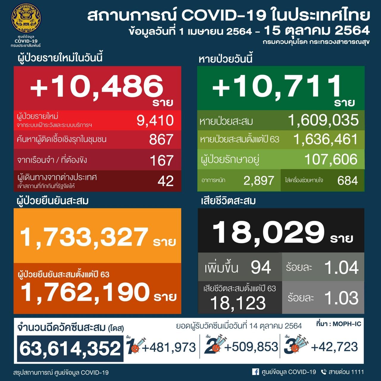 ศบค. รายงานสถานการณ์โควิดวันนี้ 15 ต.ค. 64 มีผู้ติดเชื้อ 10,486 รายใหม่ เสียชีวิต 94 ศพ อาการหนัก 2,897 ราย ยอดตรวจ ATK มี 2,192 ราย