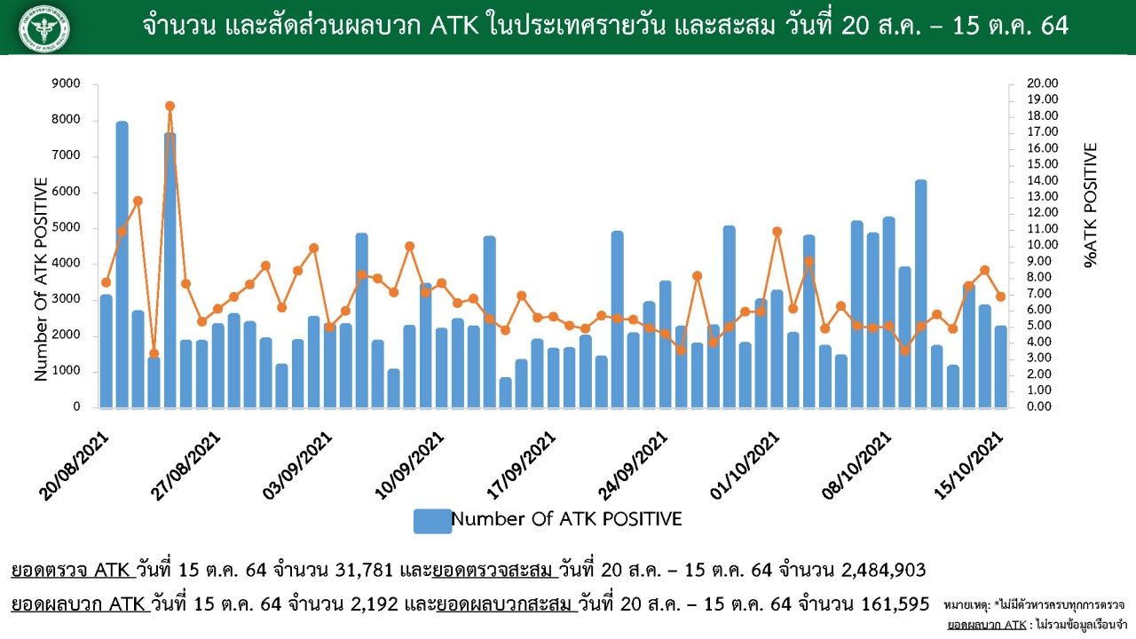 สำหรับยอดการตรวจ ATK มีรายงานผู้ติดเชื้อเข้าข่าย 2,192 ราย รวมยอดสะสม 218,580 ราย ซึ่งในจำนวนนี้ไม่รวมในการรายงานยอดผู้ติดเชื้อใหม่ซึ่งยืนยันผลด้วย RT-PCR