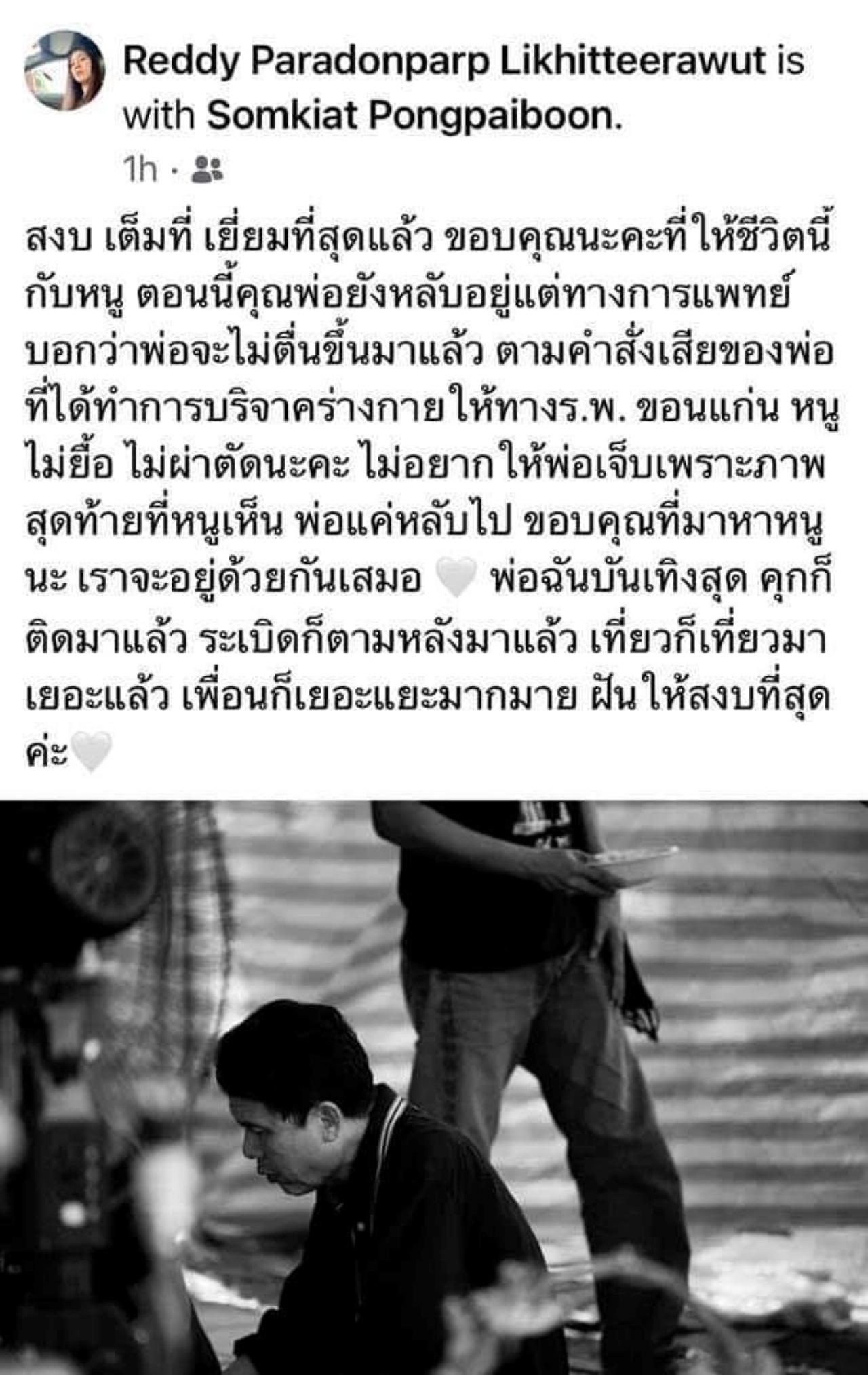 นอกจากนี้ ผู้ใช้เฟซบุ๊กคนดังกล่าว ยังโพสต์ภาพและข้อความของผู้ใช้เฟซบุ๊ก Reddy Paradonparp Likhitteerawut ซึ่งเป็นลูกสาวของนายสมเกียรติ ที่มีการแท็กเฟซบุ๊กถึงพ่อว่า "สงบ เต็มที่ เยี่ยมที่สุดแล้ว ขอบคุณนะคะที่ใช้ชีวิตนี้กับหนู ตอนนี้คุณพ่อยังหลับอยู่แต่ทางการแพทย์บอกว่าพ่อจะไม่ตื่นขึ้นมาแล้ว ตามคำสั่งเสียของพ่อที่ได้ทำการบริจาคร่างกายให้ รพ.ขอนแก่น หนูไม่ยื้อ ไม่ผ่าตัดนะคะ ไม่อยากให้พ่อเจ็บเพราะภาพสุดท้ายที่หนูเห็น พ่อแค่หลับไป ขอบคุณที่มาหาหนูนะ เราจะอยู่ด้วยกันเสมอ