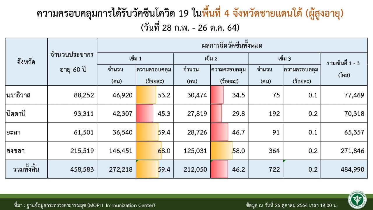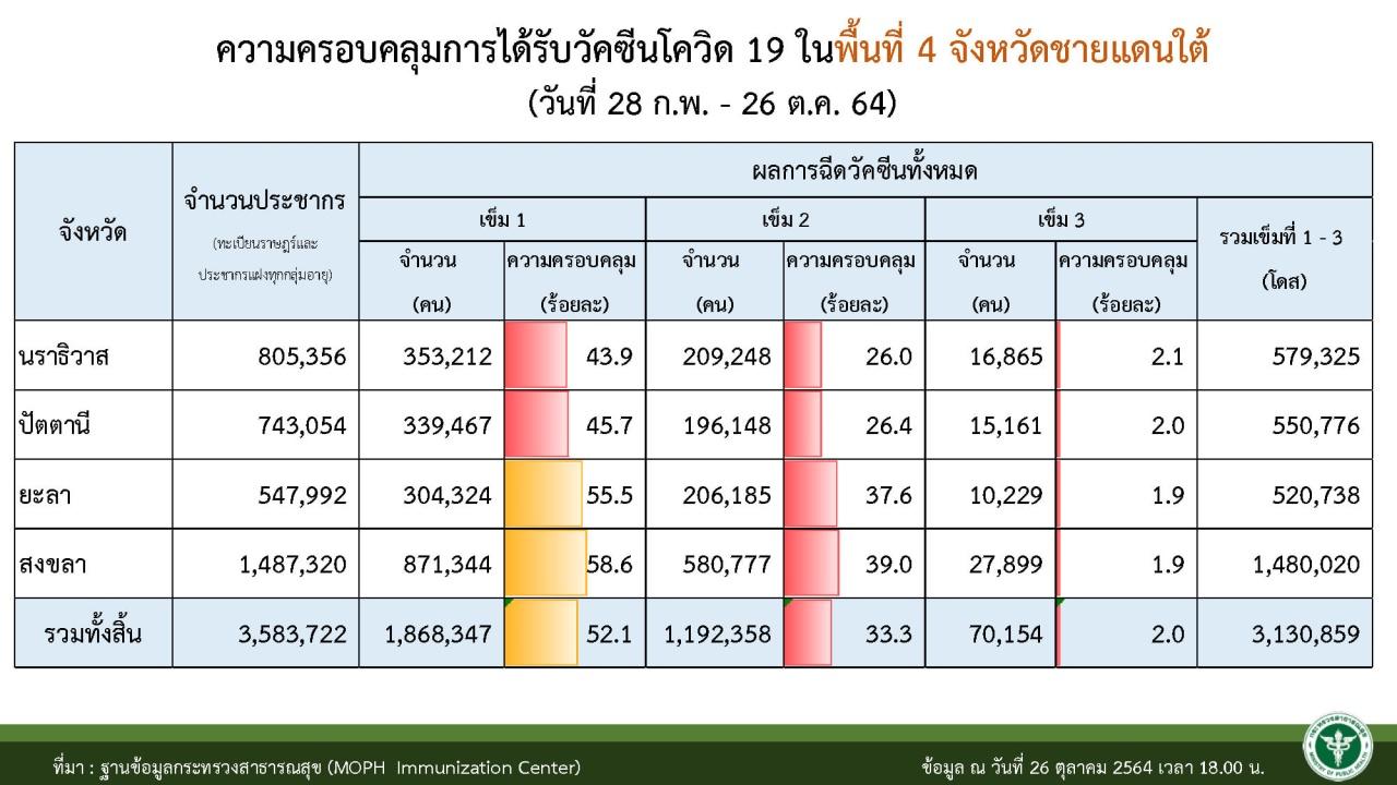 ทั้งนี้ ในส่วนพื้นที่ 4 จังหวัดชายแดนภาคใต้ มีจังหวัดที่ได้รับวัคซีนเข็มที่ 1 เกิน 50% คือ สงขลา และยะลา ส่วนนราธิวาส อยู่ที่ 43.9% และปัตตานี 45.7% ส่วนกลุ่ม 608 ค่าเฉลี่ยใน 4 จังหวัดอยู่ที่ 59.4% หากมีญาติไม่สามารถเข้ารับวัคซีนได้ให้แจ้งผู้นำชุมชน เพื่อให้แจ้งหน่วยงานสาธารณสุขมาฉีดวัคซีนต่อไป