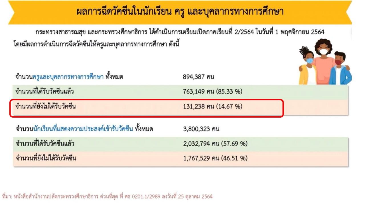 ขณะที่เมื่อช่วงเช้าที่ผ่านมาในการประชุม EOC ของกระทรวงสาธารณสุข ได้รายงานข้อมูลจากกระทรวงศึกษาธิการและเห็นชอบให้สถานศึกษาในพื้นที่จังหวัดควบคุมสูงสุดและเข้มงวด หรือพื้นที่สีแดงเข้ม และพื้นที่ควบคุม หรือพื้นที่สีแดง ต้องให้ครูและบุคลากรทางการศึกษา ต้องได้รับวัคซีนครบ 2 โดส อย่างน้อย 85% จึงจะเปิดเรียนแบบ On Site ได้ ซึ่งทางกระทรวงศึกษาธิการสำรวจพบว่า ยังต้องมีบุคคลดังกล่าวเข้ามาฉีดวัคซีนเพิ่มอีก 131,238 คน จึงขอให้รีบเข้ามารับการฉีดวัคซีน