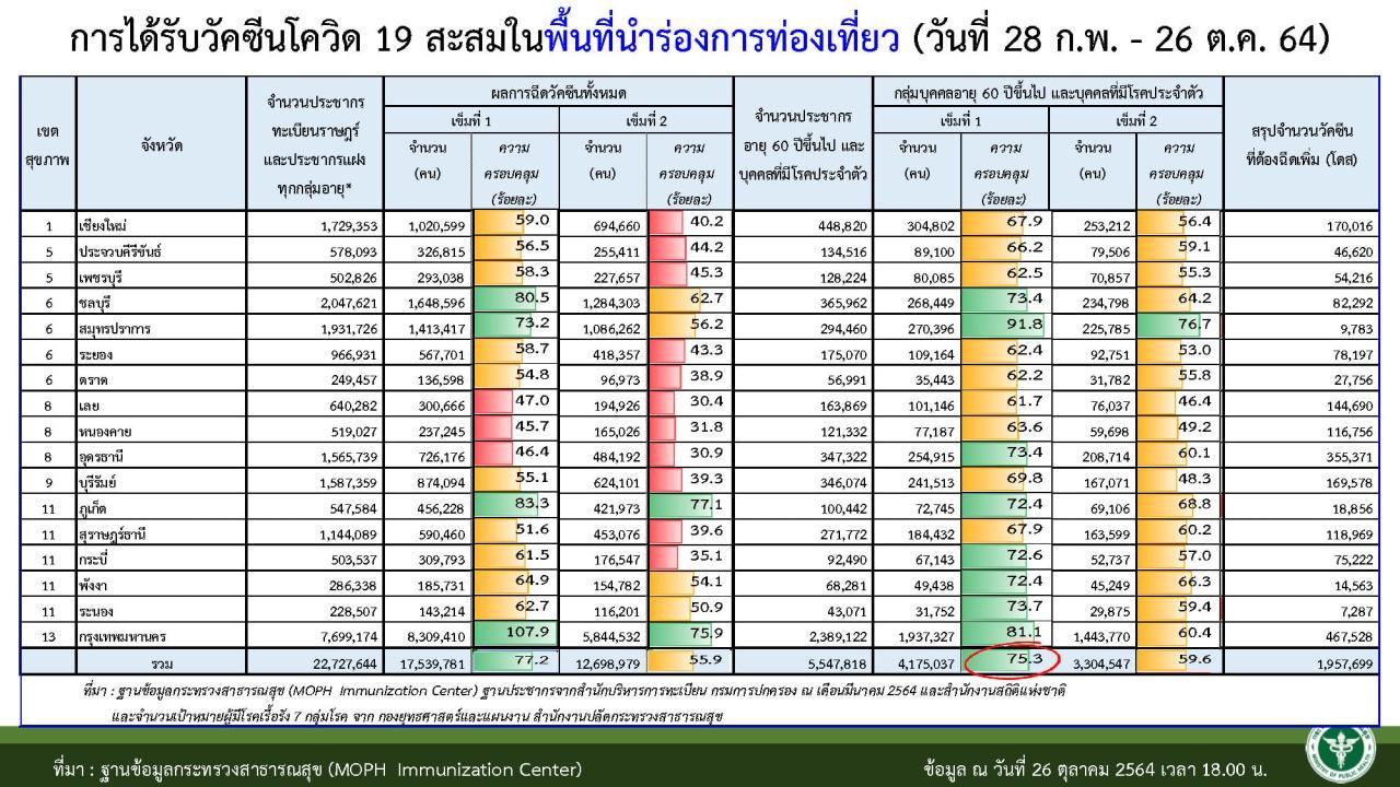 แพทย์หญิงสุมนี ยังกล่าวถึงความครอบคลุมในการรับวัคซีนของพื้นที่นำร่องท่องเที่ยว 15 จังหวัด ว่า ขอชื่นชมจังหวัดที่ฉีดวัคซีนได้ตามเป้าหมายของจำนวนประชากร ที่มีการฉีดเข็มที่ 1 อย่างน้อย 50% คือ กทม. เชียงใหม่ สมุทรปราการ ประจวบคีรีขันธ์ เพชรบุรี ชลบุรี ระยอง ตราด บุรีรัมย์ กระบี่ พังงา และระนอง