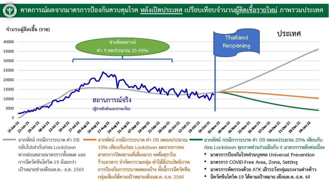 นอกจากนี้ นายแพทย์ทวีศิลป์ ยังขอความร่วมมือประชาชน หลังจากเปิดประเทศ ขอให้ปฏิบัติตามมาตรการของสาธารณสุขอย่างเคร่งครัด ทั้ง Universal Prevention และการตรวจคัดกรองด้วย ATK เนื่องจากมีการทำนายสถานการณ์โควิดออกเป็น 3 แนวทาง หลังเปิดประเทศ คือ เกิดการระบาดเท่าก่อนล็อกดาวน์ หรือ ติดเชื้อลดลง 15% เมื่อเทียบกับก่อนล็อกดาวน์ และติดเชื้อลดลง 25% เมื่อเทียบกับก่อนล็อกดาวน์.
