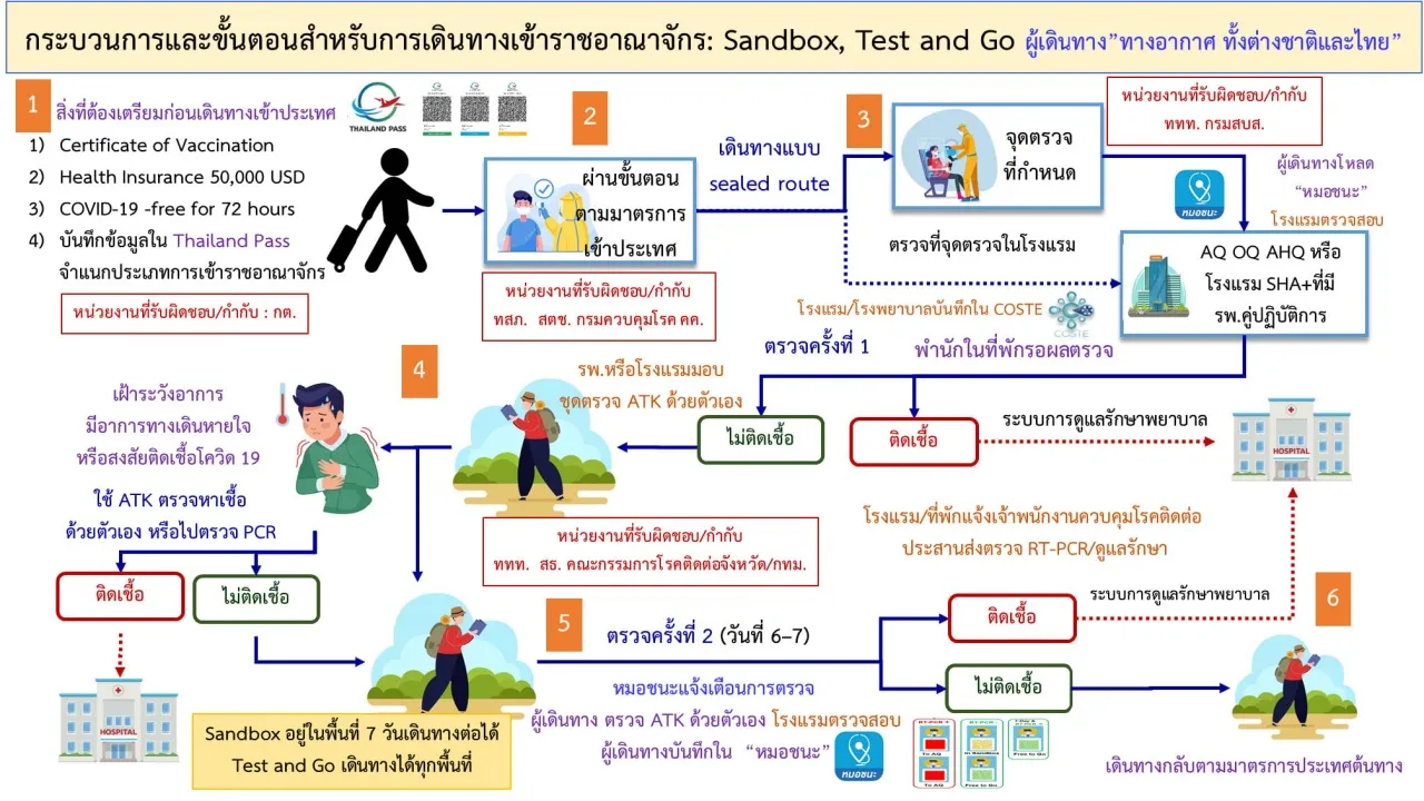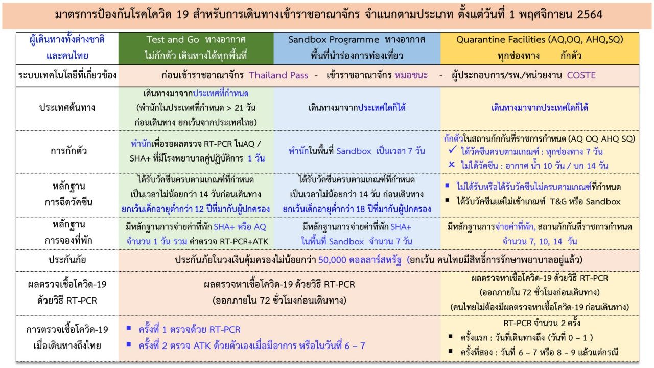 ส่วนพื้นที่ Sandbox ยังคงให้เดินทางมาทางอากาศ และมาจากประเทศใดก็ได้ แต่ต้องปฏิบัติตามเงื่อนไข ขณะที่ Quarantine Facilities ยังสามารถเดินทางมาจากประเทศใดก็ได้เช่นเดียวกัน และเดินทางได้ทุกช่องทาง แต่ต้องกักตัว และต้องปฏิบัติตามกฎระเบียบที่กำหนดอย่างเคร่งครัด