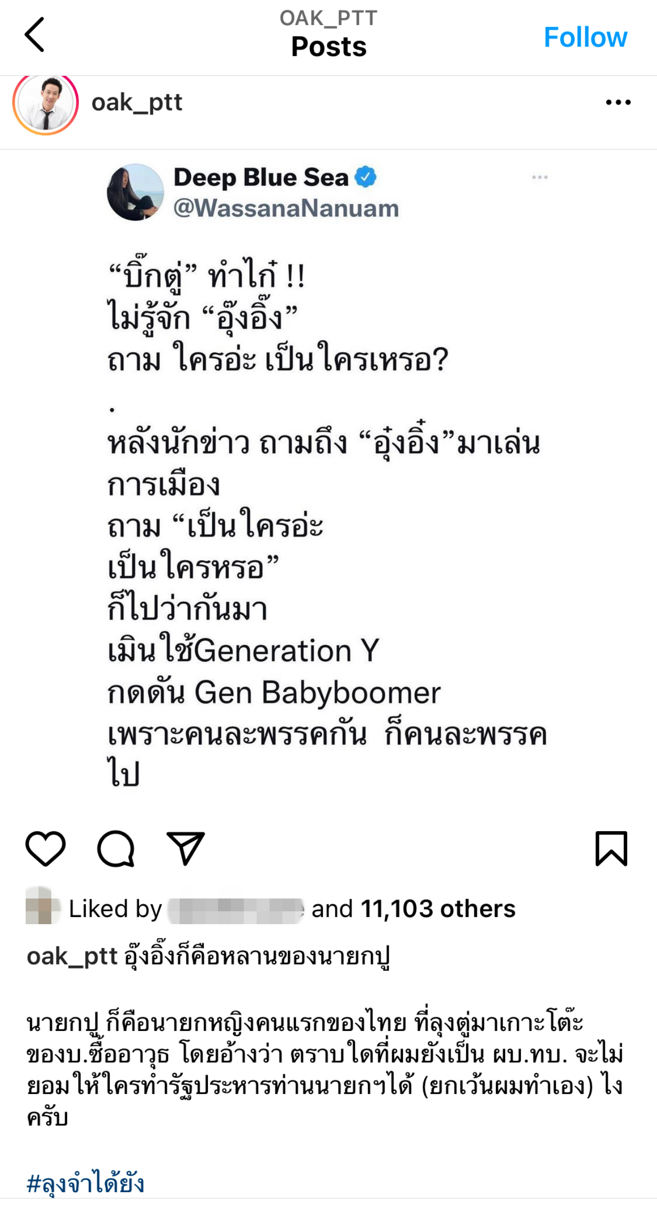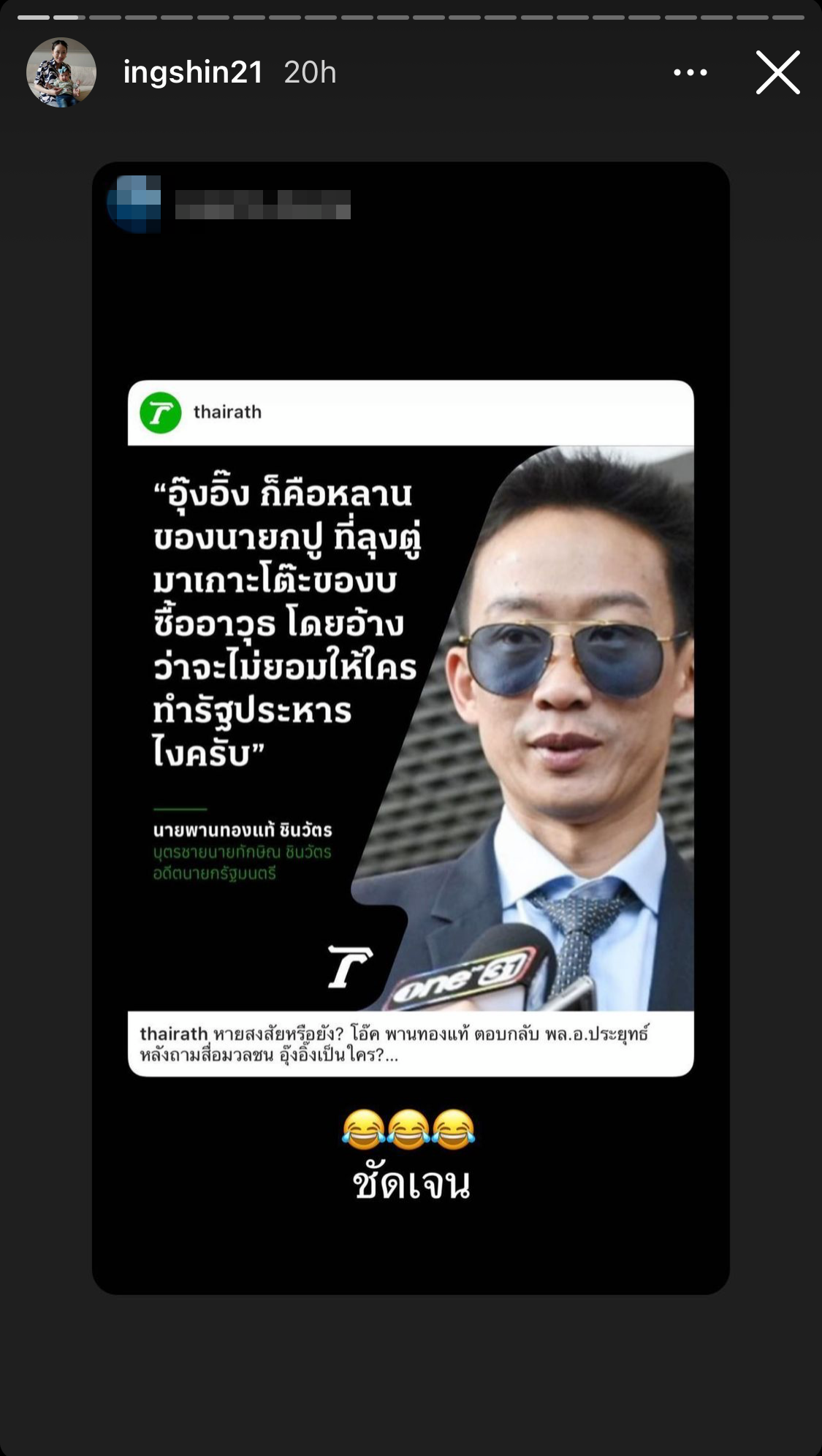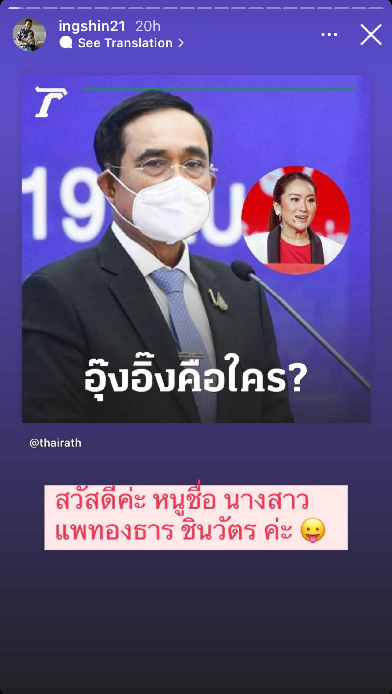 ภายหลังวานนี้ (29 ต.ค. 2564) พล.อ.ประยุทธ์ จันทร์โอชา นายกรัฐมนตรีและรัฐมนตรีว่าการกระทรวงกลาโหม ตอบคำถามสื่อมวลชนในทำนองว่าไม่รู้จัก น.ส.แพทองธาร ชินวัตร หรือ อุ๊งอิ๊ง บุตรสาวคนเล็กของ นายทักษิณ ชินวัตร อดีตนายกรัฐมนตรี ปัจจุบันเป็นประธานที่ปรึกษาด้านการมีส่วนร่วมและนวัตกรรม พรรคเพื่อไทย ซึ่งต่อมาพี่ชายอย่าง นายพานทองแท้ ชินวัตร หรือ โอ๊ค ก็โพสต์ผ่านโซเชียลมีเดียทำนองว่า อุ๊งอิ๊งคือหลานของนายกฯ ปู (น.ส.ยิ่งลักษณ์ ชินวัตร อดีตนายกรัฐมนตรี) นายกฯ ปู คือนายกฯ หญิงคนแรกของไทยที่ลุงตู่มาเกาะโต๊ะของบซื้ออาวุธในสมัยที่ยังเป็น ผบ.ทบ. (ผู้บัญชาการทหารบก) และยังระบุถึงเรื่องรัฐประหารด้วย