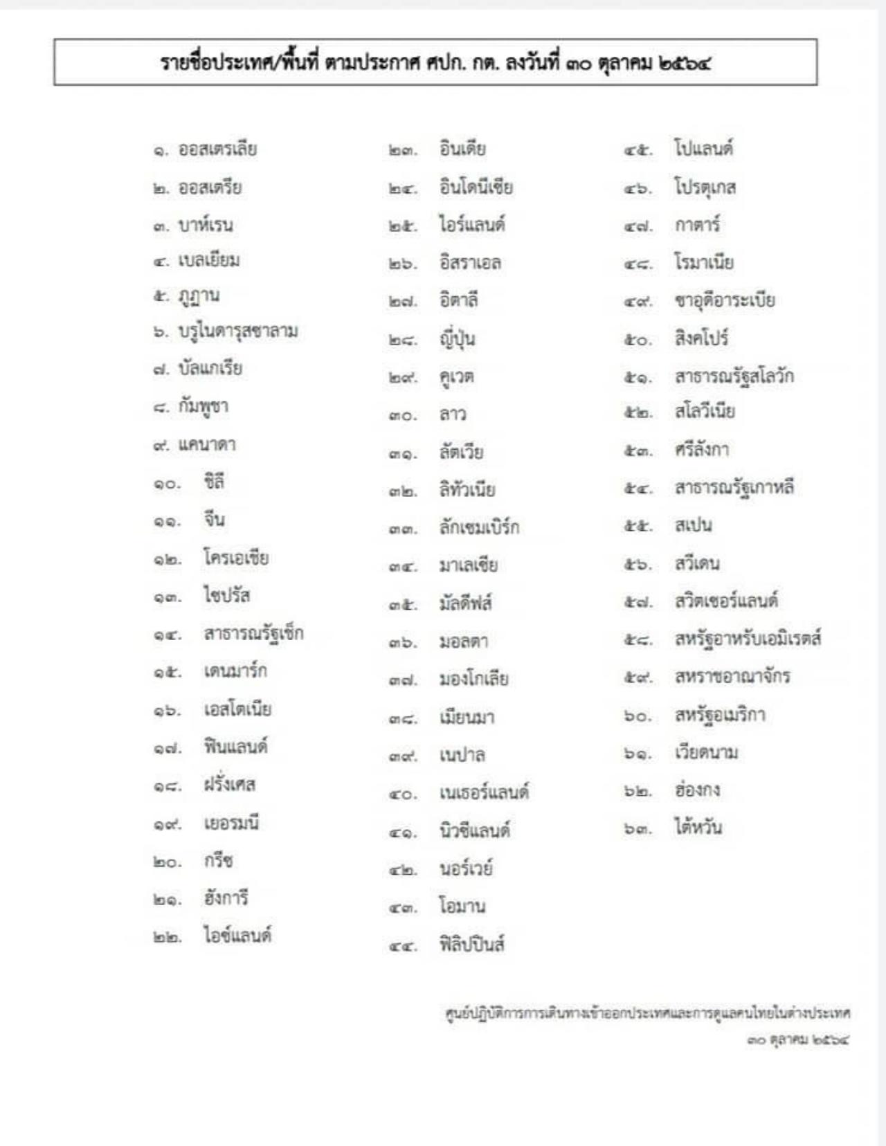 กระทรวงการต่างประเทศ ประกาศเพิ่มรายชื่อประเทศและพื้นที่เพิ่มเติม ที่ได้รับอนุญาตให้เดินทางเข้าไทย ตามแผนการเปิดประเทศของรัฐบาล เป็น 61 ประเทศ 2 เขตปกครองพิเศษ มีผลทันทีวันนี้
