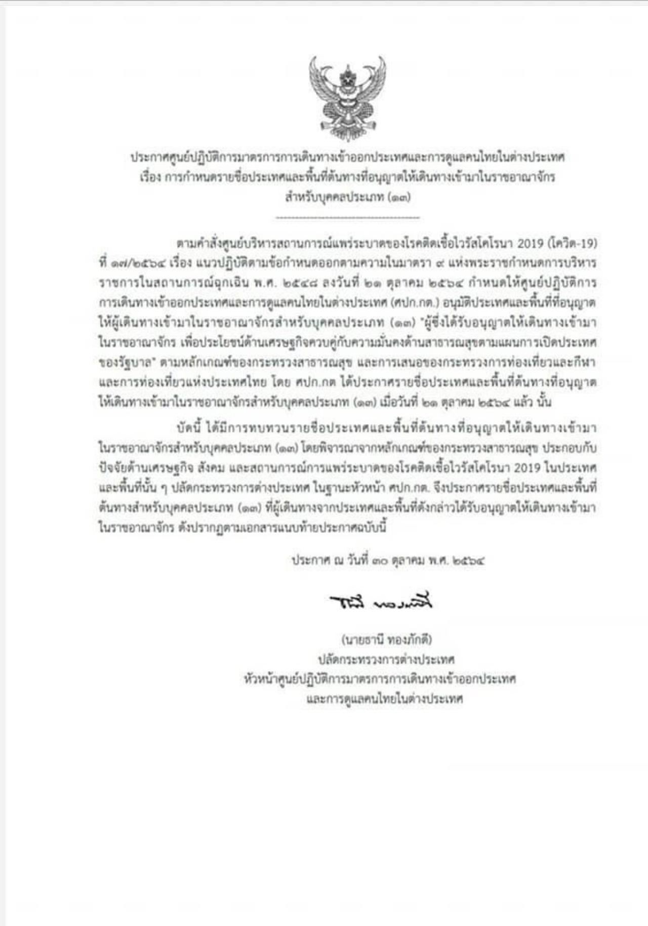กำหนดให้ศูนย์ปฏิบัติการการเดินทางเข้าออกประเทศและการดูแลคนไทยในต่างประเทศ (ศปก.กต.) อนุมัติประเทศและพื้นที่ที่อนุญาตให้ผู้เดินทางเข้ามาในราชอาณาจักรสำหรับบุคคลประเภท (13) (ผู้ซึ่งได้รับอนุญาตให้เดินทางเข้ามาในราชอาณาจักร เพื่อประโยชน์ด้านเศรษฐกิจควบคู่กับความมั่นคงด้านสาธารณสุขตามแผนการเปิดประเทศของรัฐบาล) ตามหลักเกณฑ์ของกระทรวงสาธารณสุข และการเสนอของกระทรวงการท่องเที่ยวและกีฬา และการท่องเที่ยวแห่งประเทศไทย โดย ศปก.กต ได้ประกาศรายชื่อประเทศและพื้นที่ต้นทางที่อนุญาตให้เดินทางเข้ามาในราชอาณาจักรสำหรับบุคคลประเภท (13) เมื่อวันที่ 21 ตุลาคม 2564 แล้ว นั้น