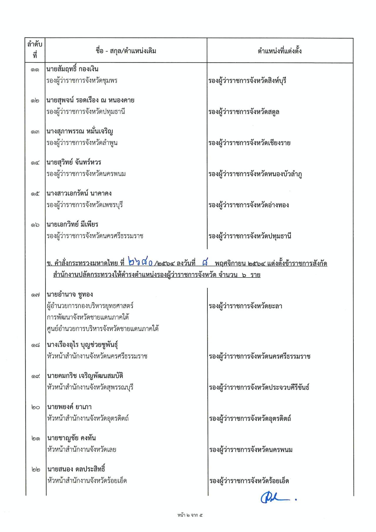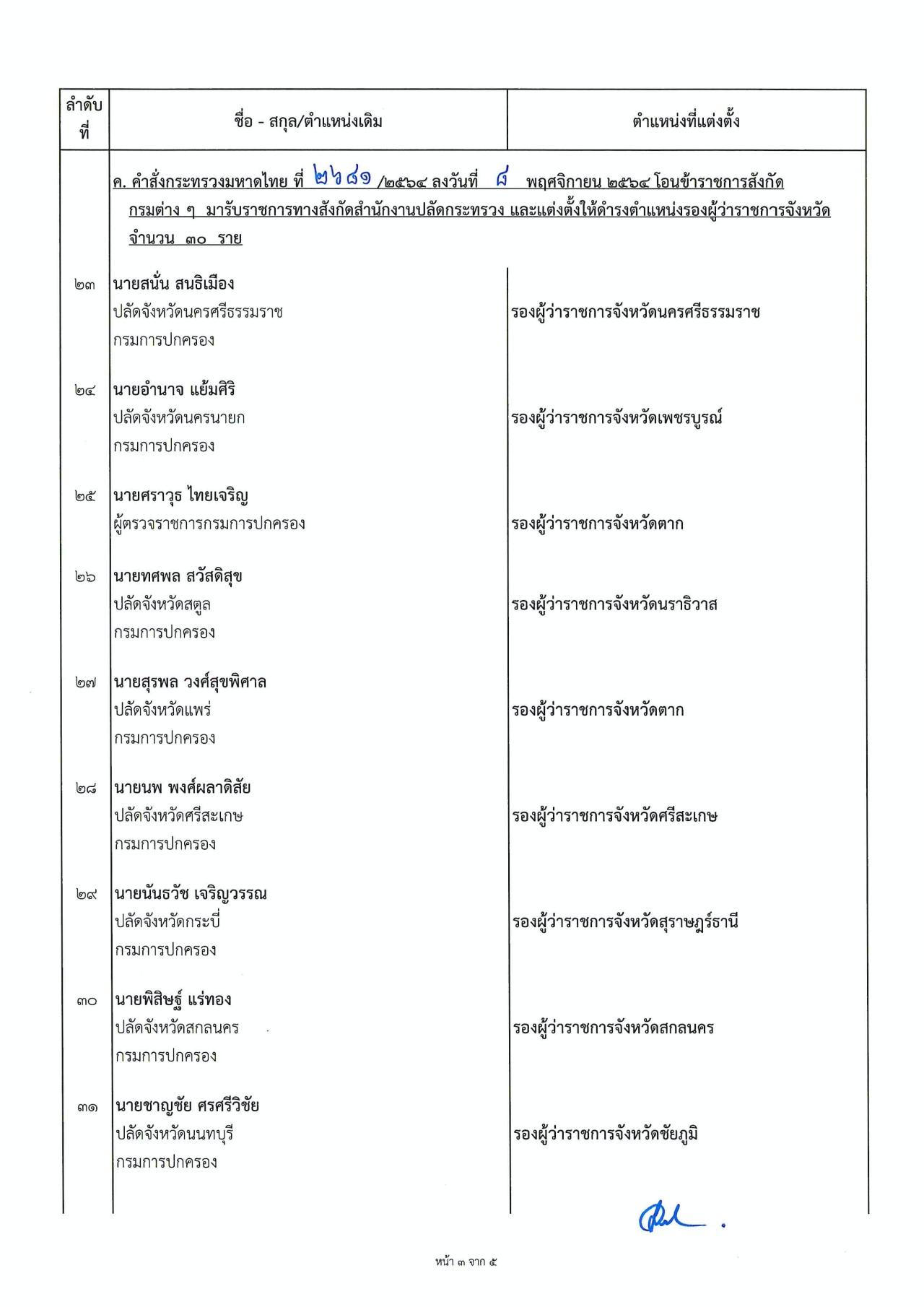 วันที่ 8 พ.ย. 64 ผู้สื่อข่าวรายงานจากกระทรวงมหาดไทย ว่า นายสุทธิพงษ์ จุลเจริญ ปลัดกระทรวงมหาดไทย ได้ลงนามคำสั่งแต่งตั้งข้าราชการดำรงตำแหน่งประเภทบริหาร ระดับต้น สายงานบริหารงานปกครอง ตำแหน่งรองผู้ว่าราชการจังหวัด จำนวน 52 ราย เพื่อทดแทนผู้เกษียณอายุราชการ ทั้งนี้ ตั้งแต่วันที่ 15 พ.ย. 64 เป็นต้นไป โดยกำหนดให้เดินทางไปรายงานตัวเพื่อปฏิบัติหน้าที่ตามคำสั่งในวันที่ 15 พ.ย. 2564 ดังต่อไปนี้
