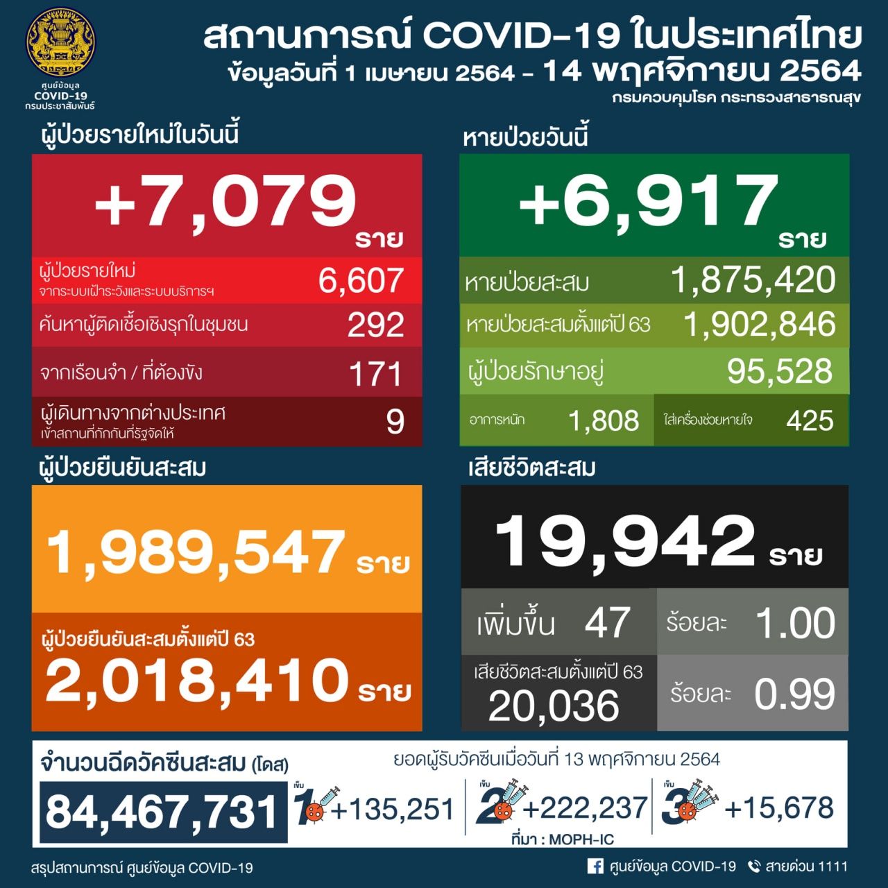 วันที่ 14 พฤศจิกายน 2564 ศูนย์บริหารสถานการณ์แพร่ระบาดของโรคติดเชื้อไวรัสโคโรนา 2019 (โควิด-19) หรือ ศบค. รายงานสถานการณ์ผู้ติดเชื้อโควิด-19 ในประเทศไทยมีรายละเอียดดังนี้
