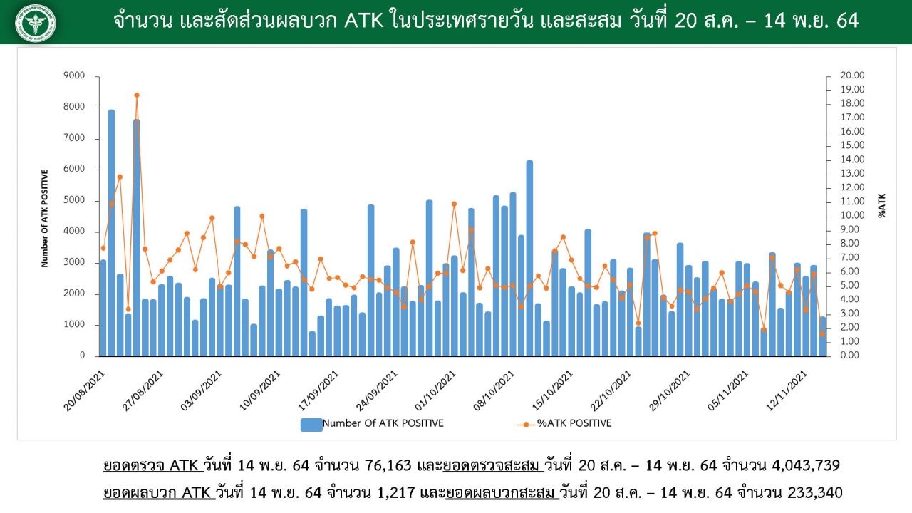 สำหรับยอดการตรวจ ATK วันที่ 13 พ.ย. 2564 มียอดตรวจ 76,163 คน พบผู้ติดเชื้อเข้าข่าย 1,217 ราย ซึ่งจำนวนนี้ไม่รวมในการรายงานยอดผู้ติดเชื้อใหม่ซึ่งยืนยันผลด้วย RT-PCR
