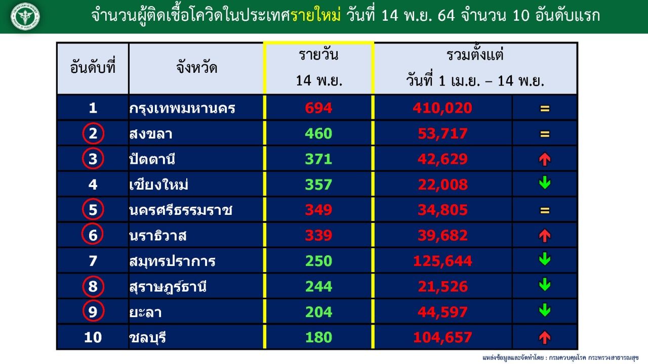 ส่วนผู้ติดเชื้อรายจังหวัดมากที่สุด 5 จังหวัด คือ กรุงเทพมหานคร ยังคงติดเชื้อเป็นอันดับ 1 คือ 694 ราย รองลงมา สงขลา 460 ราย ปัตตานี 371 ราย เชียงใหม่ 357 ราย และนครศรีธรรมราช 349 ราย.