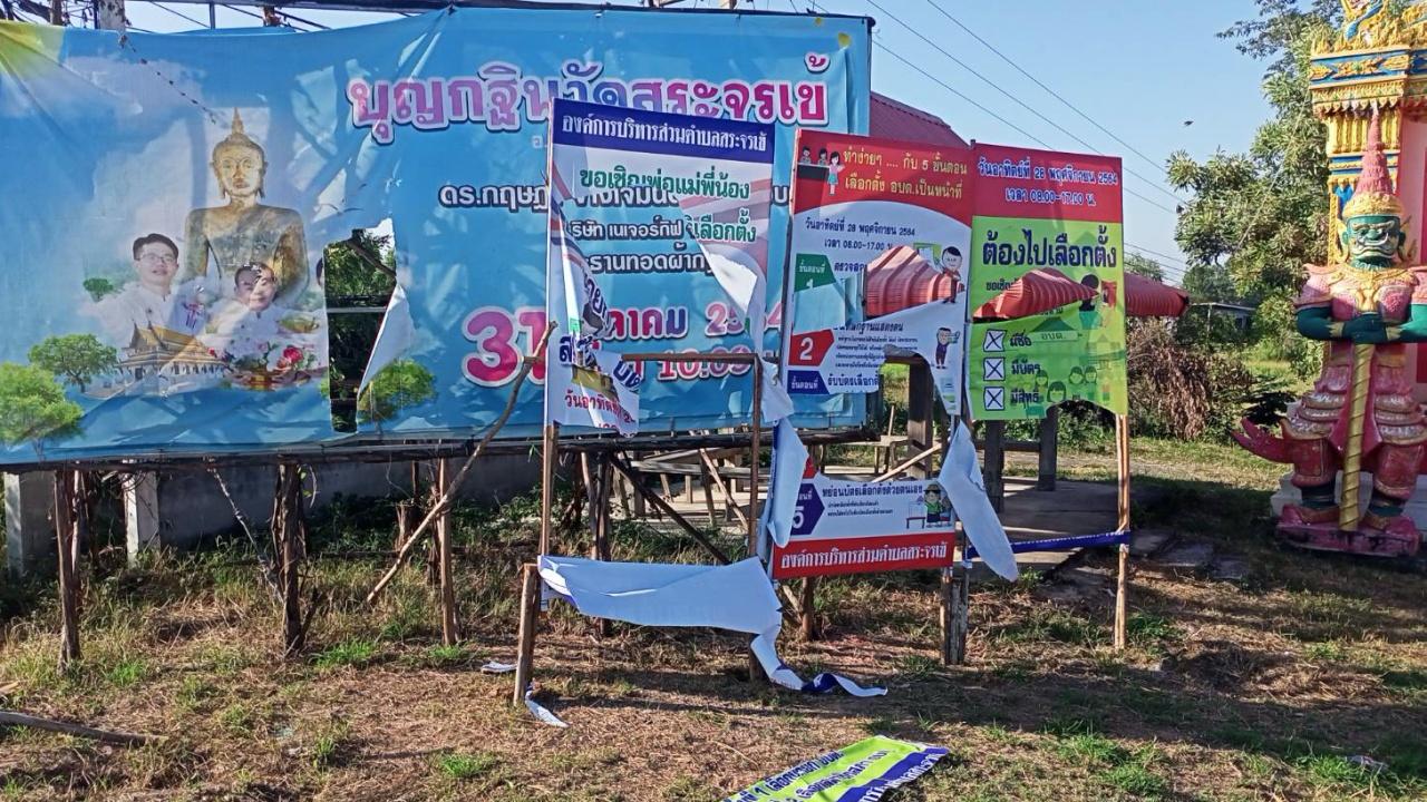 "กำนันยงค์" ผู้สมัครนายก อบต.สระจรเข้ อ.ด่านขุนทด โคราช แจ้งความ หลังป้ายหาเสียงถูกทำลายรอบสองภายในเวลา 15 วัน ขณะที่ตำรวจยังไม่รู้ฝีมือ ด้านผกก.บอกไม่ต้องห่วง ส่งสายสืบลงพื้นที่แล้ว