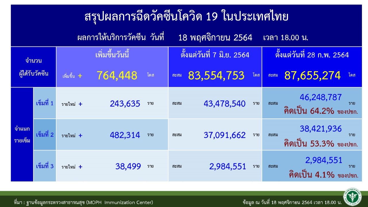 ส่วนยอดการฉีดวัคซีนตั้งแต่วันที่ 7 มิ.ย. 2564-18 พ.ย. 2564 สะสมแล้ว 83,554,753 โดส