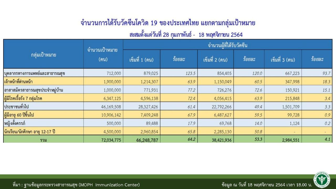 วันที่ 19 พ.ย. 2564 ศูนย์บริหารสถานการณ์แพร่ระบาดของโรคติดเชื้อไวรัสโคโรนา 2019 (โควิด-19) หรือ ศบค. รายงานยอดฉีดวัคซีนทั่วประเทศ วันที่ 18 พ.ย. 2564 มีรายละเอียดดังนี้