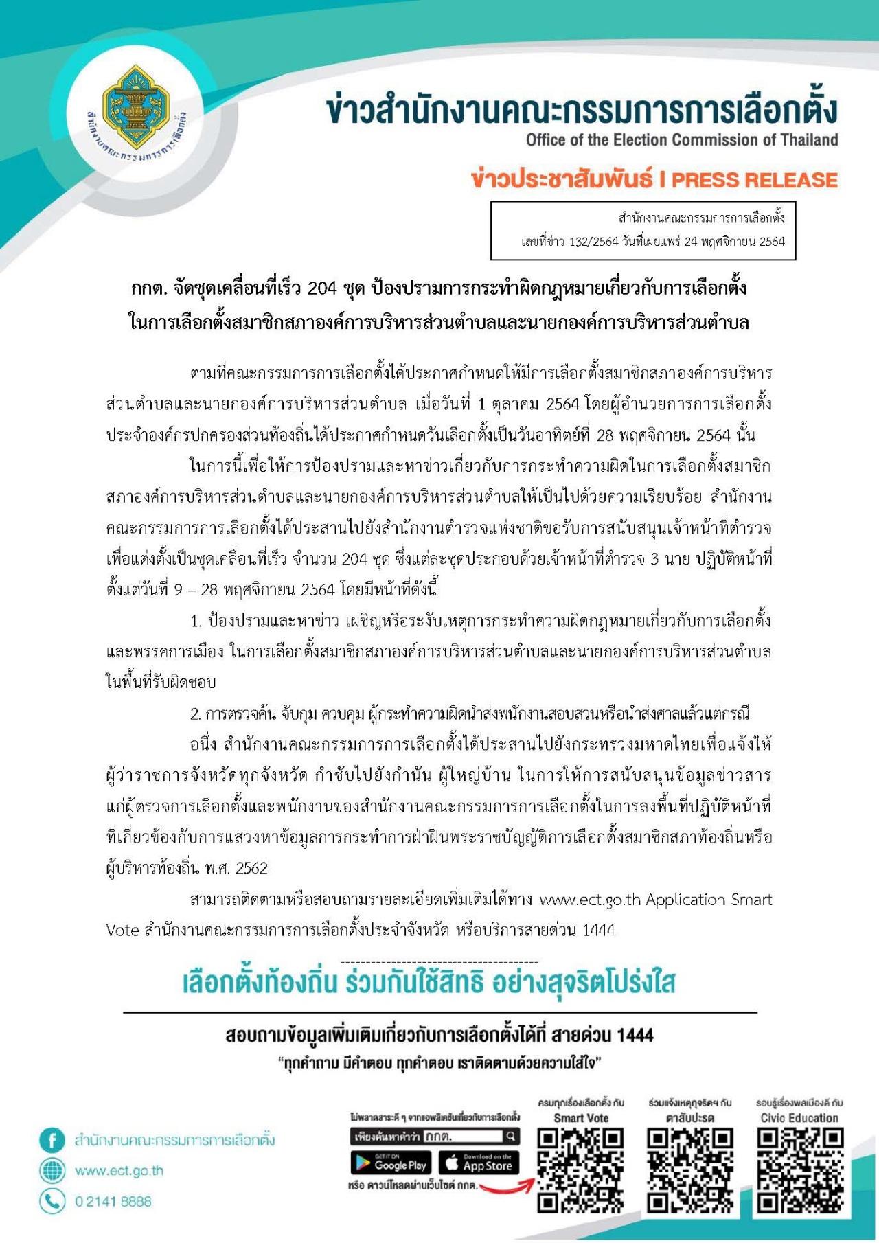 ในการนี้เพื่อให้การป้องปรามและหาข่าวเกี่ยวกับการกระทำความผิดในการเลือกตั้งสมาชิกสภาองค์การบริหารส่วนตำบลและนายกองค์การบริหารส่วนตำบลให้เป็นไปด้วยความเรียบร้อย สำนักงานคณะกรรมการการเลือกตั้ง ได้ประสานไปยังสำนักงานตำรวจแห่งชาติ ขอรับการสนับสนุนเจ้าหน้าที่ตำรวจเพื่อแต่งตั้งเป็นชุดเคลื่อนที่เร็ว จำนวน 204 ชุด ซึ่งแต่ละชุดประกอบด้วยเจ้าหน้าที่ตำรวจ 3 นาย ปฏิบัติหน้าที่ตั้งแต่วันที่ 9 – 28 พฤศจิกายน 2564 โดยมีหน้าที่ดังนี้
