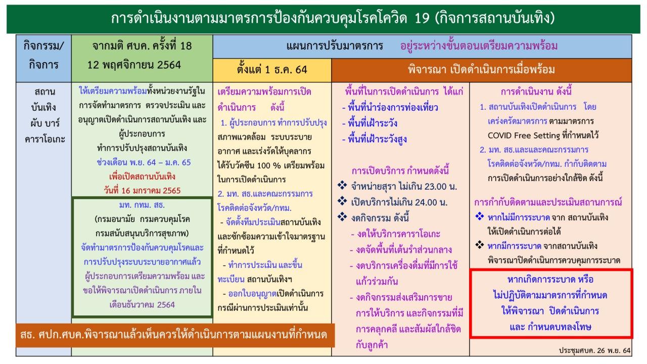 นายแพทย์ ทวีศิลป์ กล่าวต่อว่า ส่วนการปรับมาตรการป้องกันควบคุมโควิด-19 กรณียื่นเรื่อง ร้องขอเปิดสถานบันเทิงก่อนปีใหม่ เนื่องจากผู้ประกอบการและผู้ประกอบอาชีพกลางคืน มีความเดือดร้อนอย่างหนัก ให้กับ เลขาธิการ สมช. และ ทางเลขาฯ สมช. มีการนำข้อมูลที่เสนอมา เสนอเข้าที่ประชุม ศบค. หลายครั้ง ทั้งนี้ที่ประชุม ศบค.ชุดใหญ่ วันนี้มีเหตุผลว่า หากต้องเปิดสถานบันเทิง มีความเสี่ยงหลายประเด็น ได้แก่ 1 ปัญหาการถ่ายเทอากาศในสถานบันเทิง 2 เป็นเรื่องพฤติกรรมส่วนบุคคล เพราะการดื่ม ต้องมีการถอดแมสก์ และทำให้มีการครองสติยากขึ้น และยังทำให้มีโอกาสระยะเวลาการอยู่ในสถานที่นั้น นานมากยิ่งขึ้น มากกว่า การรับประทานอาหารเฉยๆ ซึ่งก็มีการหารือกันอย่างกว้างขวางในที่ประชุมใหญ่ ศบค. ในวันนี้