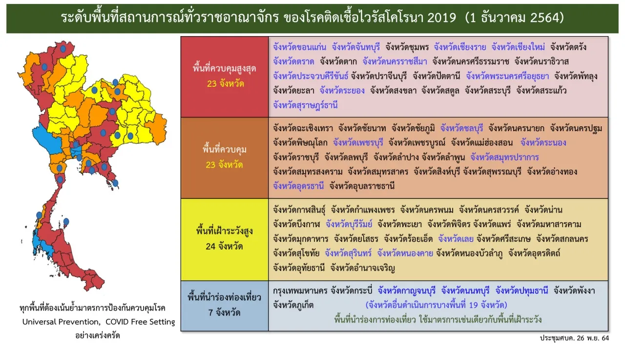 ขณะพื้นที่เฝ้าระวังสูง (สีเหลือง) 5 จังหวัด ปรับเป็น 24 จังหวัด พื้นที่เฝ้าระวัง (สีเขียว) ไม่มี ส่วนพื้นที่สีฟ้า (นำร่องการท่องเที่ยว) จากเดิม 4 จังหวัด ปรับเพิ่มเป็น 7 จังหวัด ได้แก่ กรุงเทพมหานคร, กระบี่, กาญจนบุรี, นนทบุรี, ปทุมธานี, พังงา และภูเก็ต
