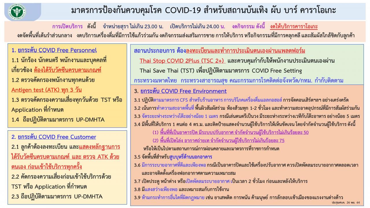 "ปีที่แล้ว 2563 เรามีเกิดเหตุขึ้น ทำให้ปีที่แล้ว เราพลาดโอกาสการฉลองเทศกาลปีใหม่ ทำให้ภาพลักษณ์ของประเทศไทย ดูไม่ดีในสายตานานาชาติ เนื่องจากมาตรการควบคุมโรคไม่ประสบความสำเร็จ ที่ประชุมจึงขอให้ดำเนินการตามแผนงานเดิม คือ เปิดสถานบันเทิง 16 ม.ค. 65 แต่ที่ประชุมก็ได้มีการพูดคุยหารือกันว่า เอายังงี้ให้ดูความพร้อมผู้ประกอบการ เป็นระยะๆ ถ้าผู้ประกอบการ ทำได้ตามมาตรการที่กระทรวงสาธารณสุขกำหนด ก็อาจพิจารณา เปิดให้เร็วกว่าเดิมได้เช่นกัน โดยเน้นว่าผู้ประกอบการ ต้องสามารถทำได้ตามมาตรการ โควิด ฟรีเซตติ้ง อย่างเคร่งครัด หากทำได้ก็จะได้เปิดได้เร็วขึ้น" นายแพทย์ทวีศิลป์ กล่าว