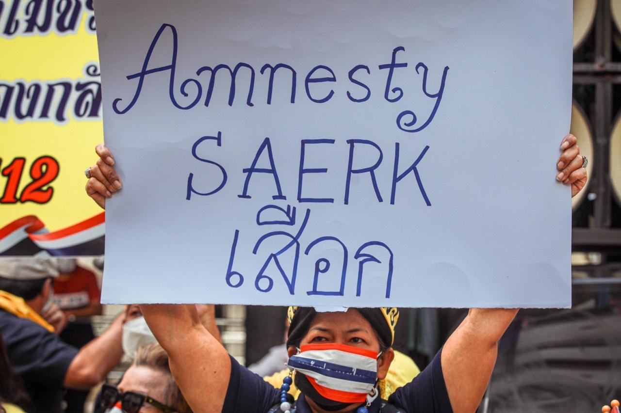 แน่นอนว่าม็อบอีกกลุ่มเกิดความไม่พอใจอย่างหนัก จนเกิดการรวมตัวของ กลุ่มพสกนิกรปกป้องสถาบัน ออกมายื่นหนังสือถึงนายกรัฐมนตรี เมื่อวันที่ 25 พ.ย. 2564 เพื่อให้ ขับไล่ แอมเนสตี้ ออกจากประเทศไทย ซึ่งนายเสกสกล อัตถาวงศ์ ผู้ช่วยรัฐมนตรีประจำนายกรัฐมนตรีที่ออกมารับหนังสือด้วยตนเอง ก็ร่วมปราศรัยอย่างดุดันเอาด้วยว่าจะกดดัน แอมเนสตี้ ด้วยกฎหมายทุกทาง และจะกดดันด้วยพลังพี่น้องประชาชนที่จงรักภักดีกับสถาบัน พร้อมประกาศว่า หากไล่แอมเนสตี้ ออกนอกประเทศไม่ได้ จะลาออกจากตำแหน่ง