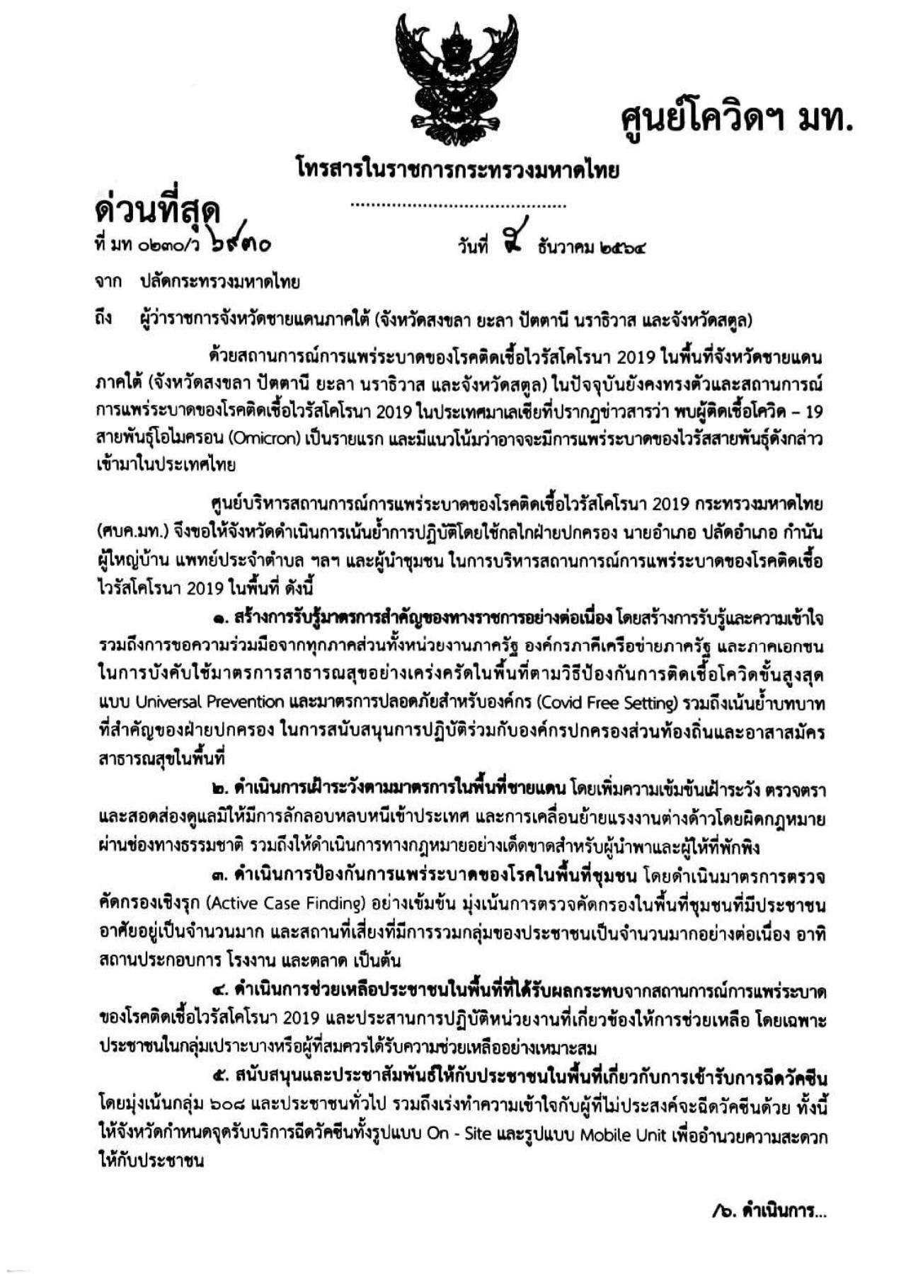 มหาดไทย กำชับผู้ว่าฯ 5 จังหวัดชายแดนภาคใต้ เฝ้าระวังสถานการณ์การแพร่ระบาดของโรคโควิด-19 หลังพบผู้ติดเชื้อโอมิครอน รายแรกที่ประเทศมาเลเซีย เน้นย้ำฝ่ายปกครองติดตามข่าวสารอย่างใกล้ชิด