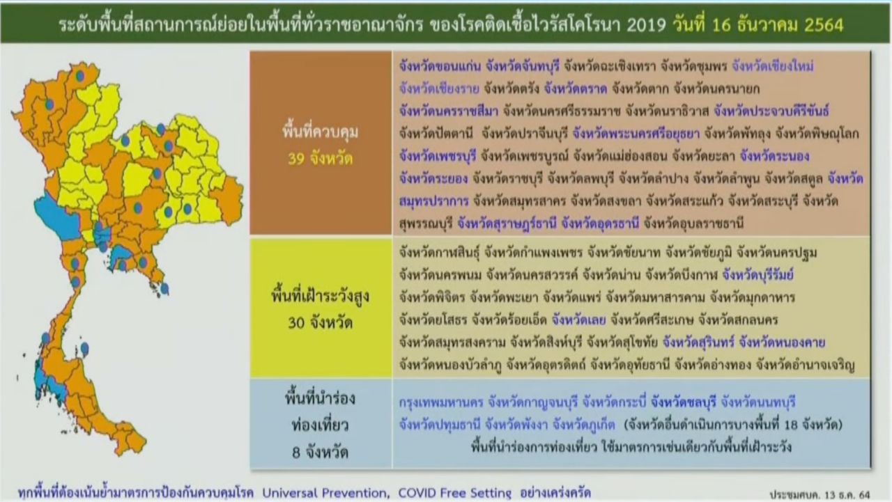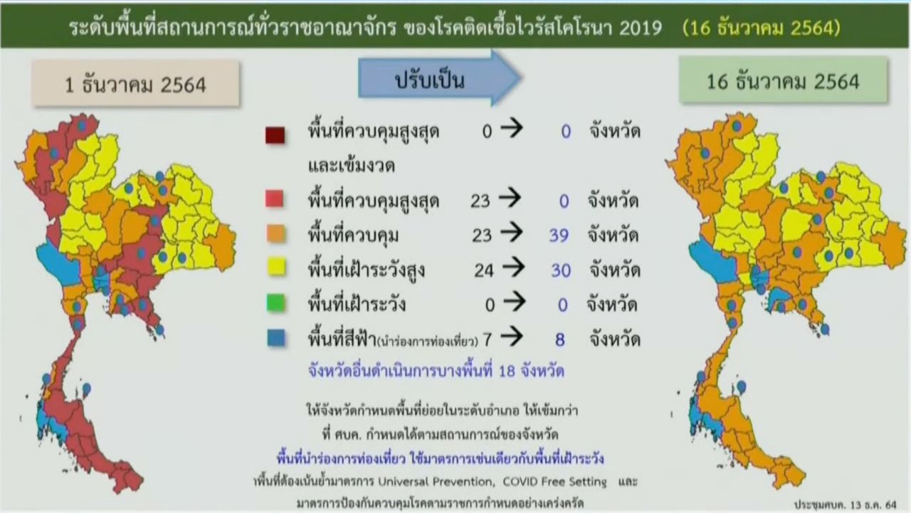 เมื่อเวลา 12.00 น. วันที่ 13 ธ.ค. 2564 นายแพทย์ทวีศิลป์ วิษณุโยธิน โฆษกศูนย์บริหารสถานการณ์การแพร่ระบาดของโรคติดเชื้อไวรัสโคโรนา 2019 (โควิด-19) หรือ ศบค. แถลงข่าวหลังการประชุม ศบค.ชุดใหญ่ มีมติเห็นชอบปรับระดับสีทั่วราชอาณาจักร ตั้งแต่ 16 ธ.ค. 2564 เป็นต้นไป โดยคงไว้เพียงพื้นที่ควบคุม (สีส้ม) และพื้นที่เฝ้าระวังสูง (สีเหลือง) โดยไม่มีสีแดงแล้ว
